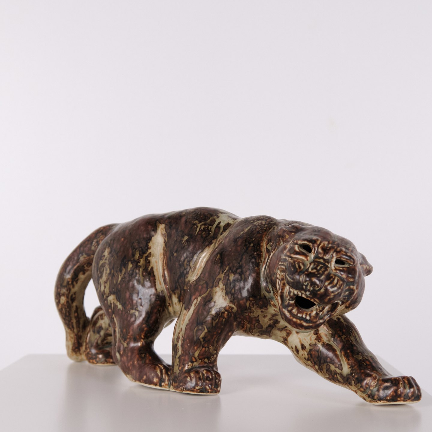 Steinzeugfigur mit Panthermotiv, Modell 20283, entworfen von Knud Kyhn für Royal Copenhagen. Die Figur wurde aus Steinzeug gefertigt und gehört zu Knud Kyhns Tierdarstellungen, die bei Royal Copenhagen produziert wurden und dem dänischen Keramikdesign des 20. Jahrhunderts zuzuordnen sind.