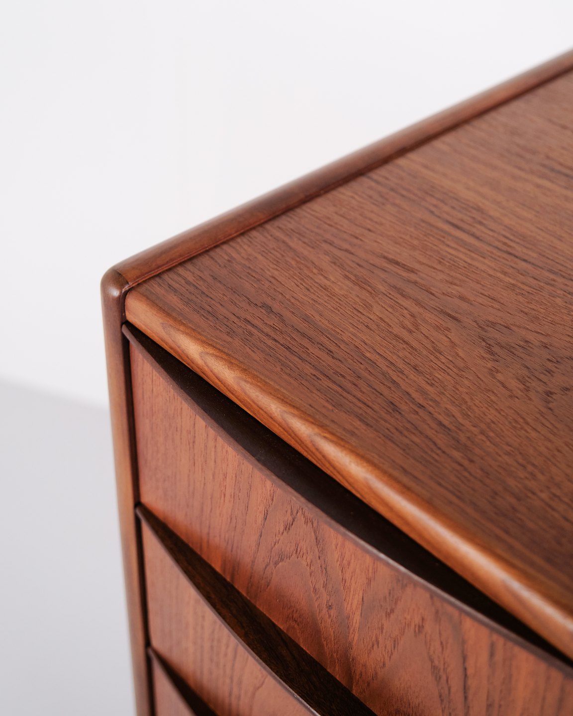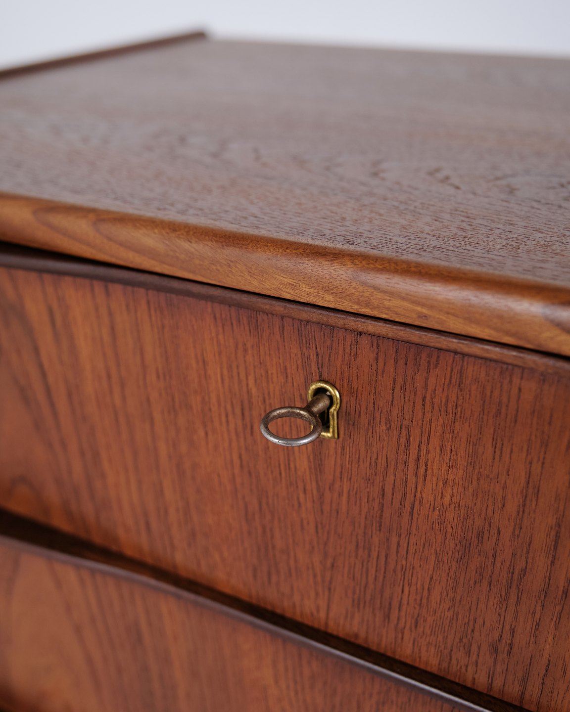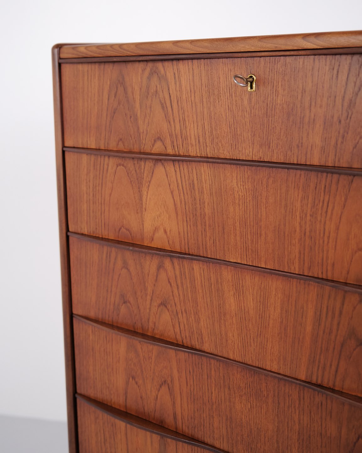 Kommode aus Teakholz mit sechs Schubladen und originalen Griffen. Das Möbelstück ist ein Beispiel für dänisches Möbeldesign der 1950er-Jahre mit Fokus auf Funktionalität, Stauraum und Materialqualität. Durch die hohe Form eignet sich die Kommode für Schlafzimmer, Flur oder Wohnbereich.