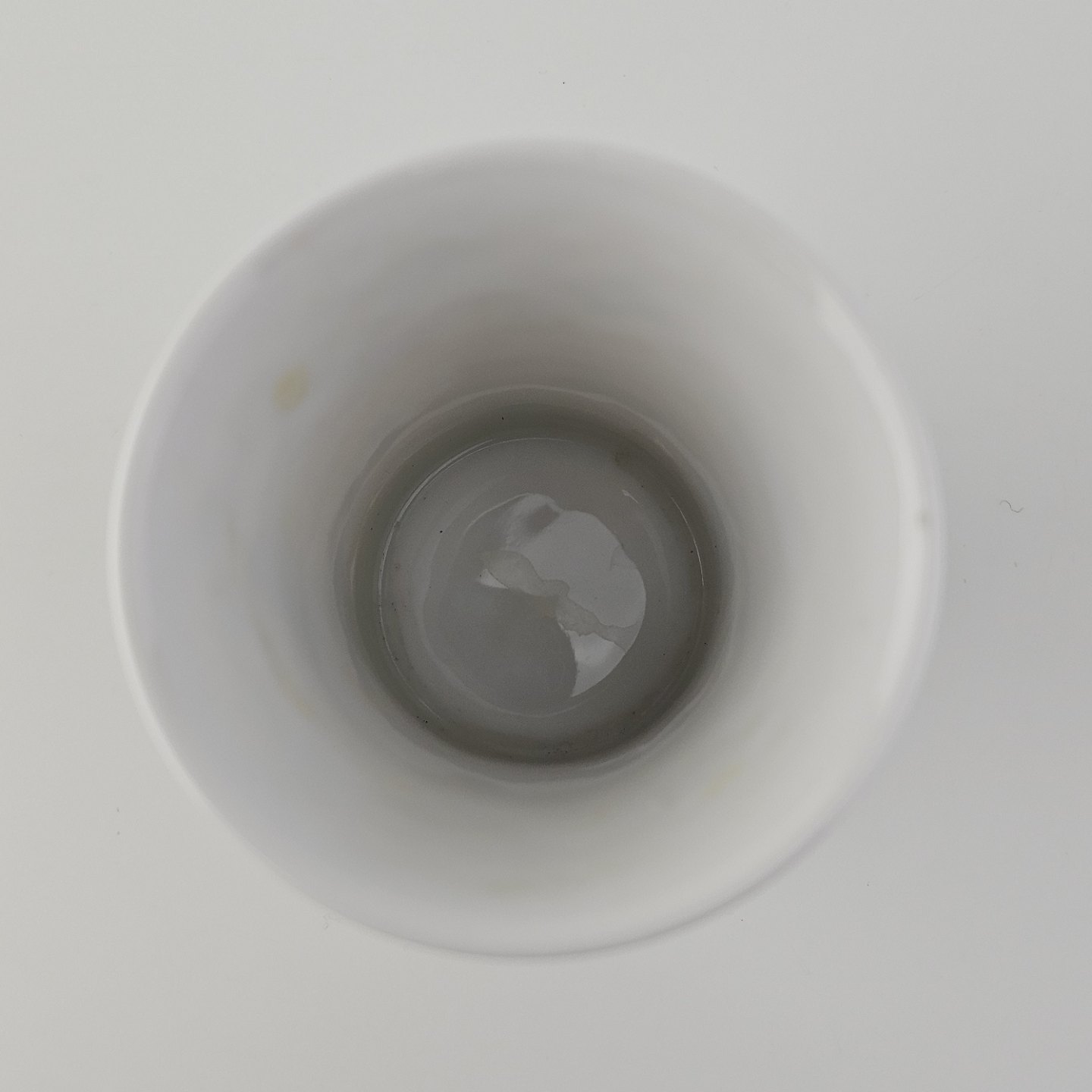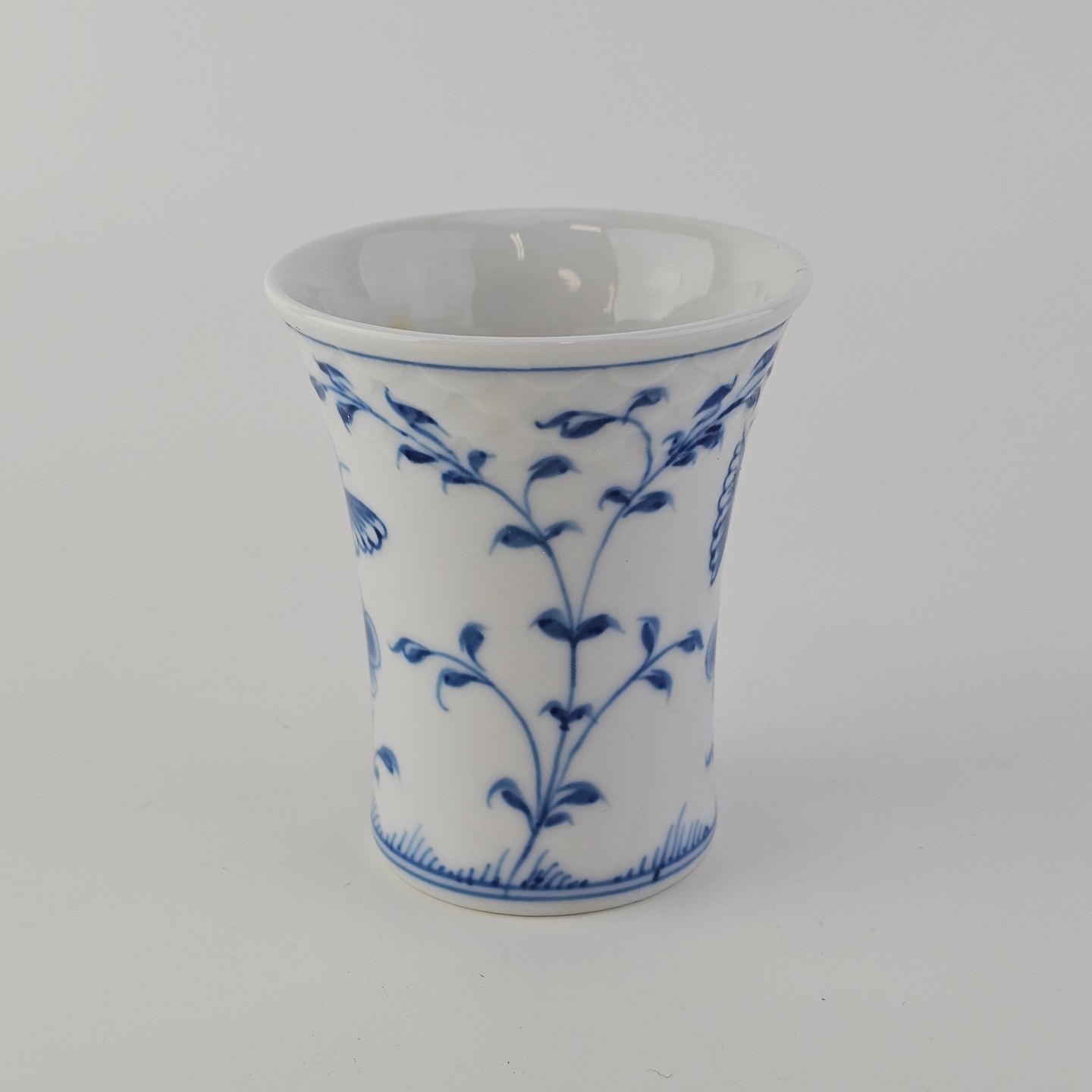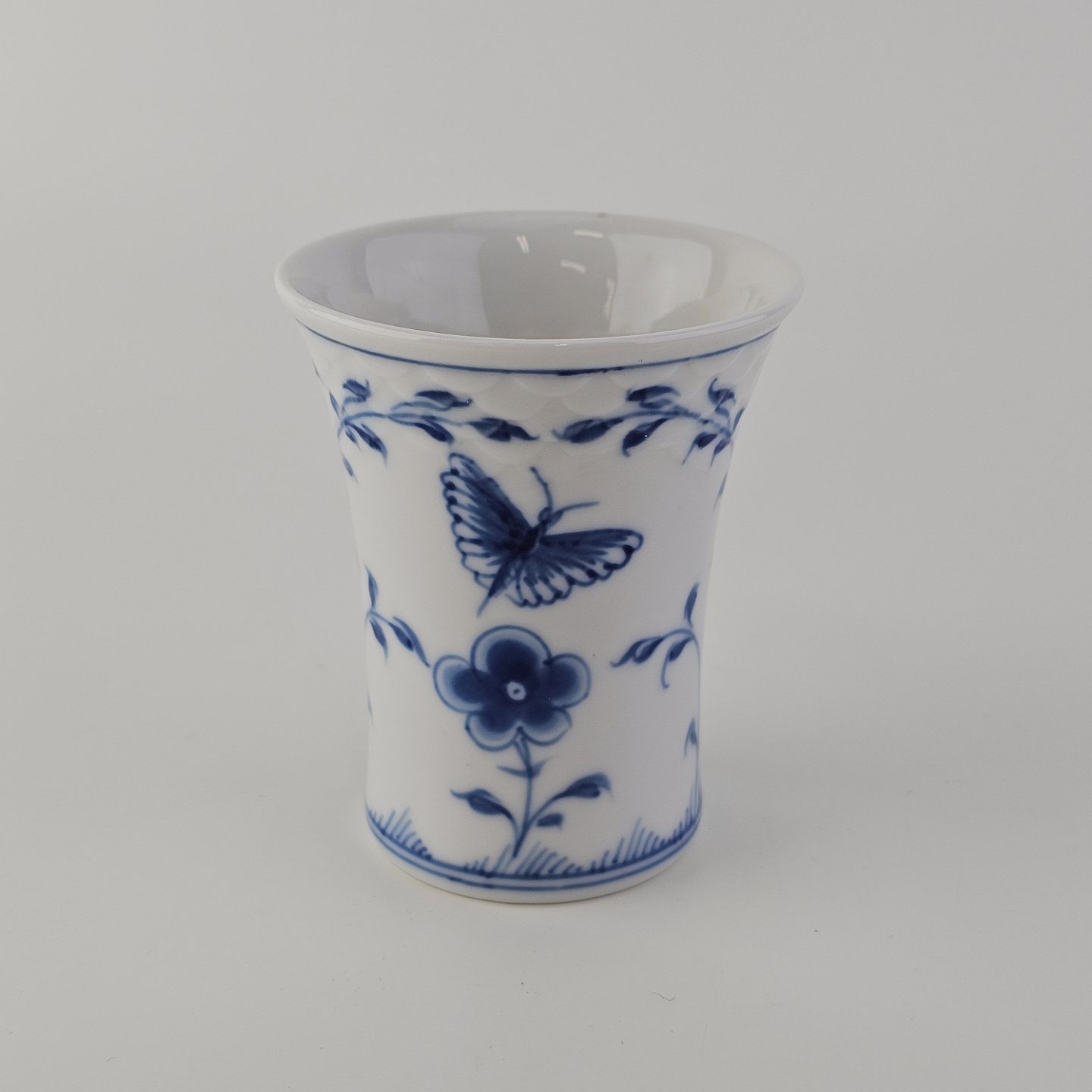 Service i hvidt skælformet porcelæn med blå motiver af blomster og sommerfugle
