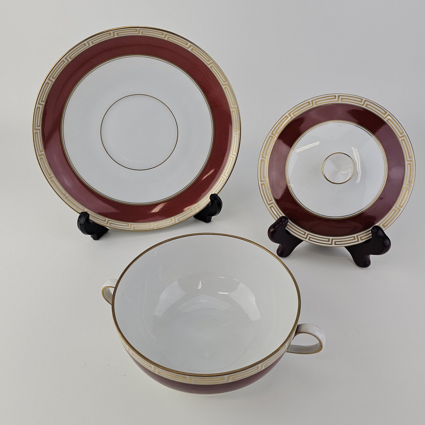Service i porcelæn med rød bort, græsk inspireret guld bort og guldkant
