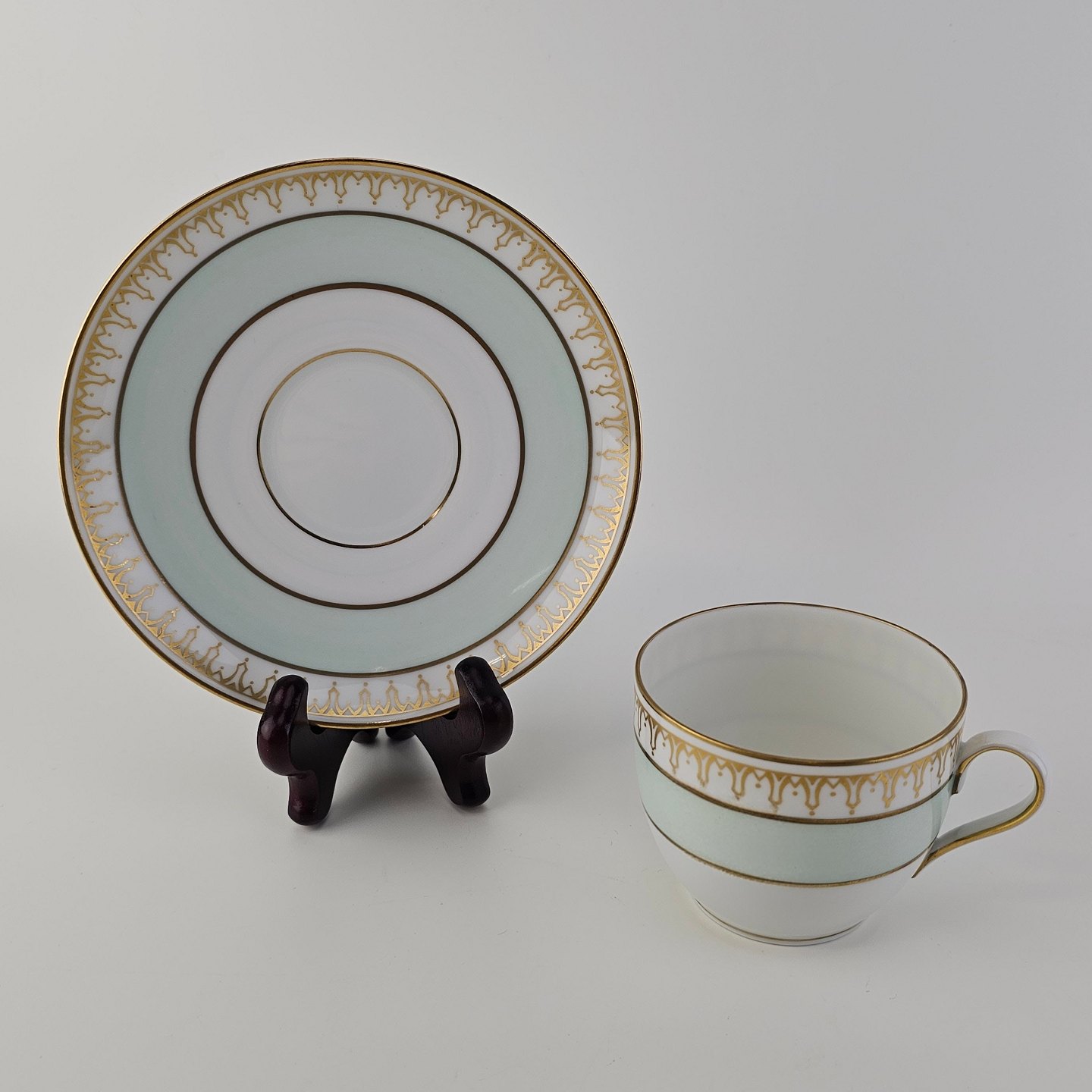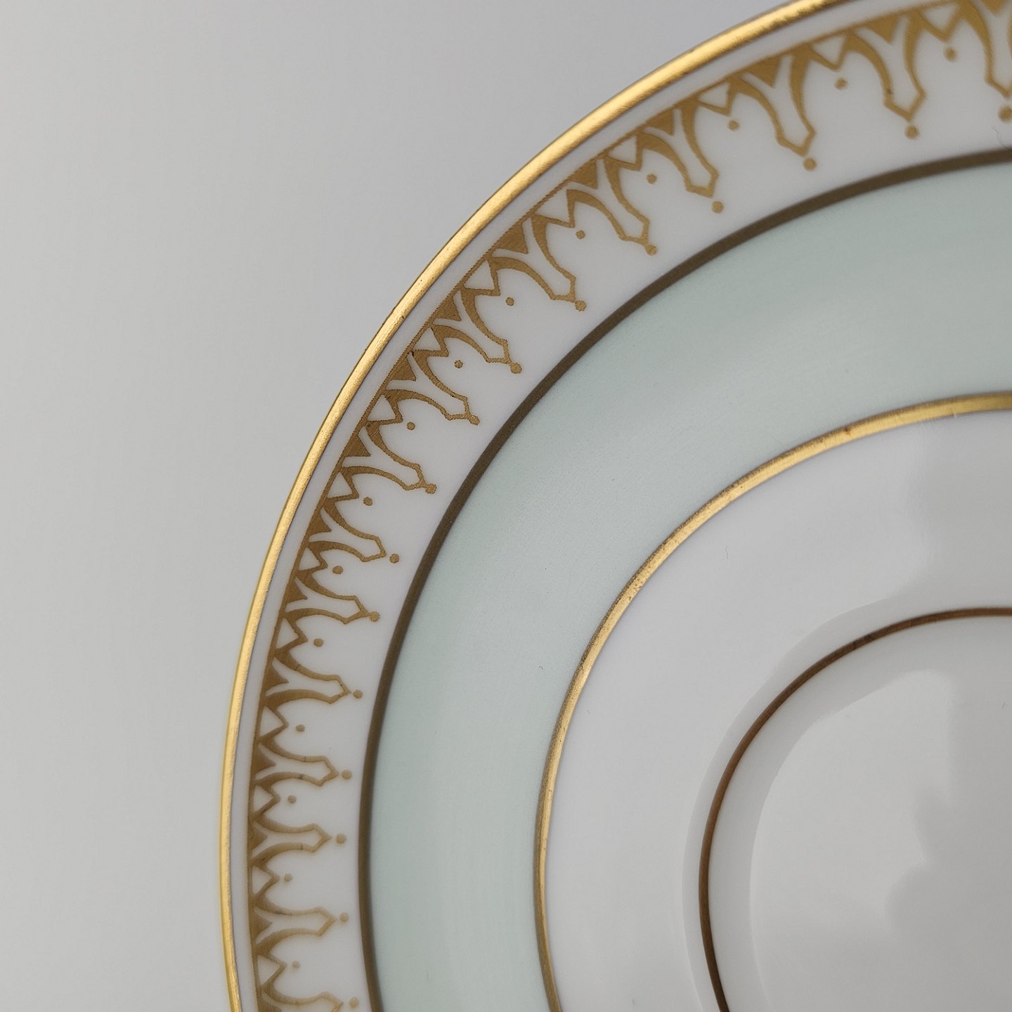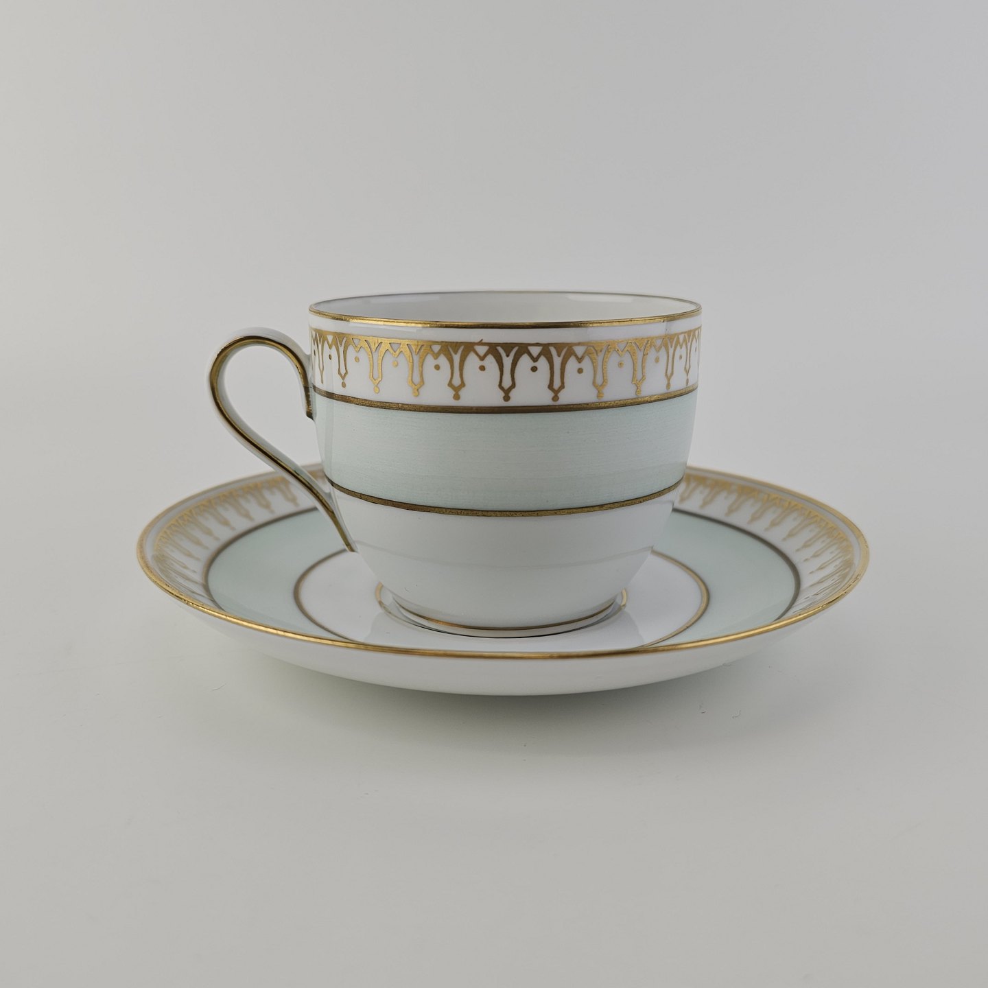 Thorvaldsen er stel i glat hvidt porcelæn med lysegrøn bort, forgyldt dekoration og guldkant