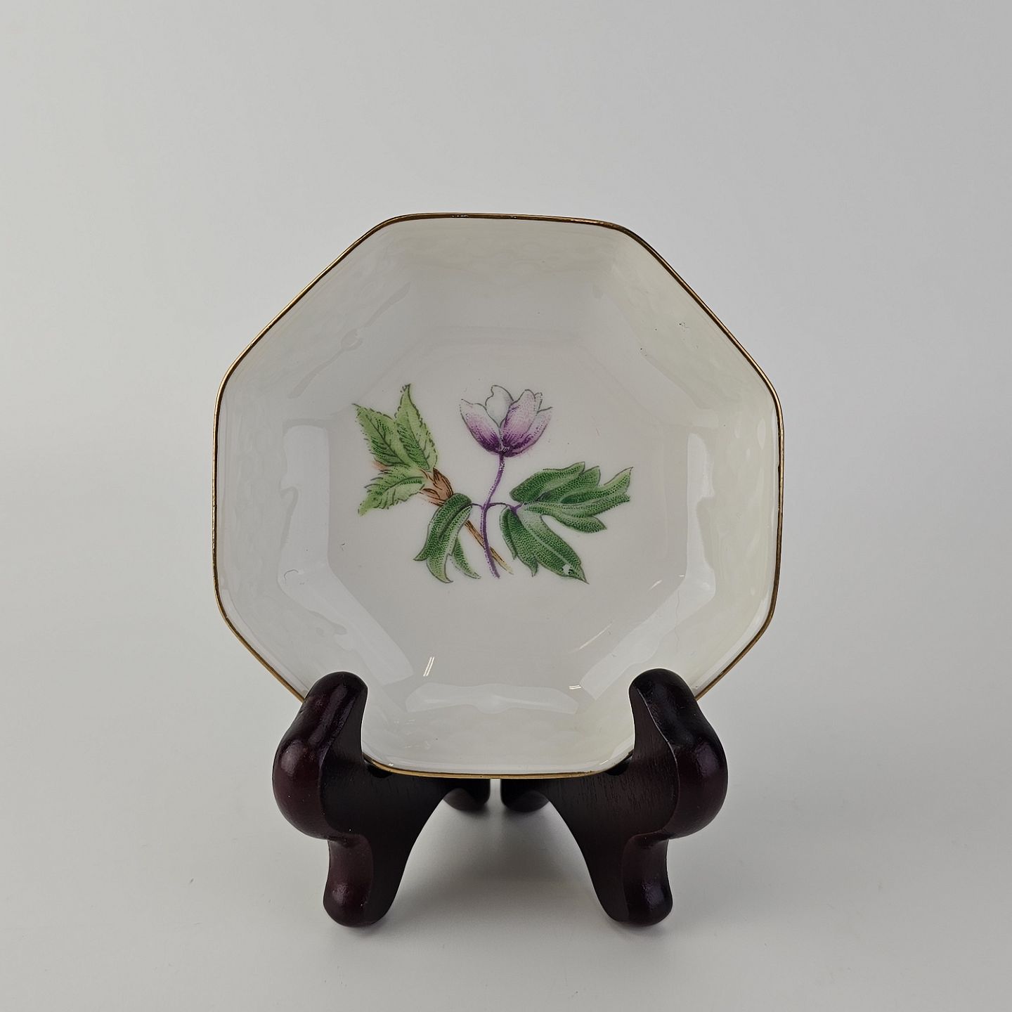 Frigga Anemone er cremefarvet porcelæn dekoreret med motiv af anemoner og bøgeløv med guldkant