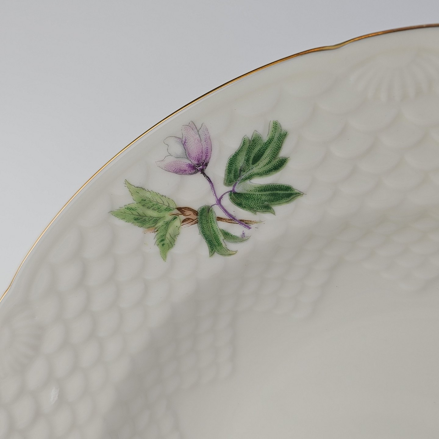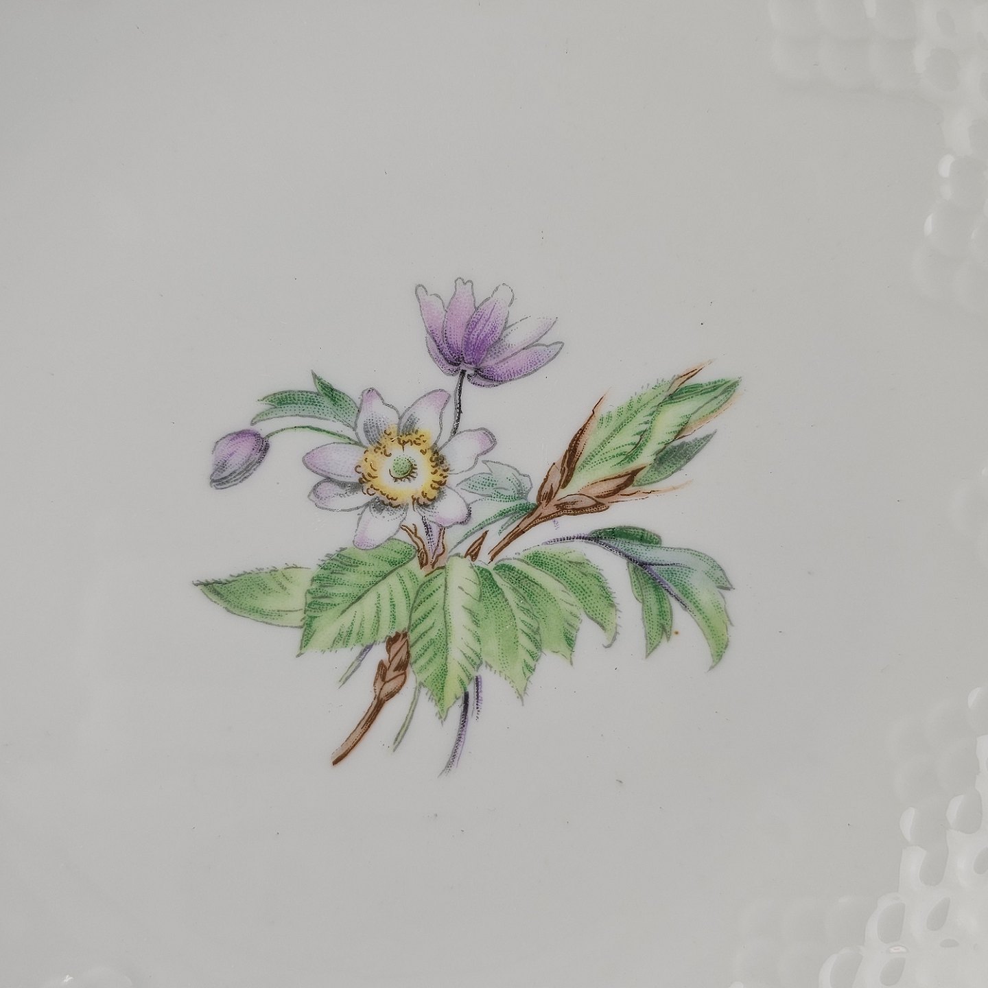 Frigga Anemone er cremefarvet porcelæn dekoreret med motiv af anemoner og bøgeløv med guldkant
