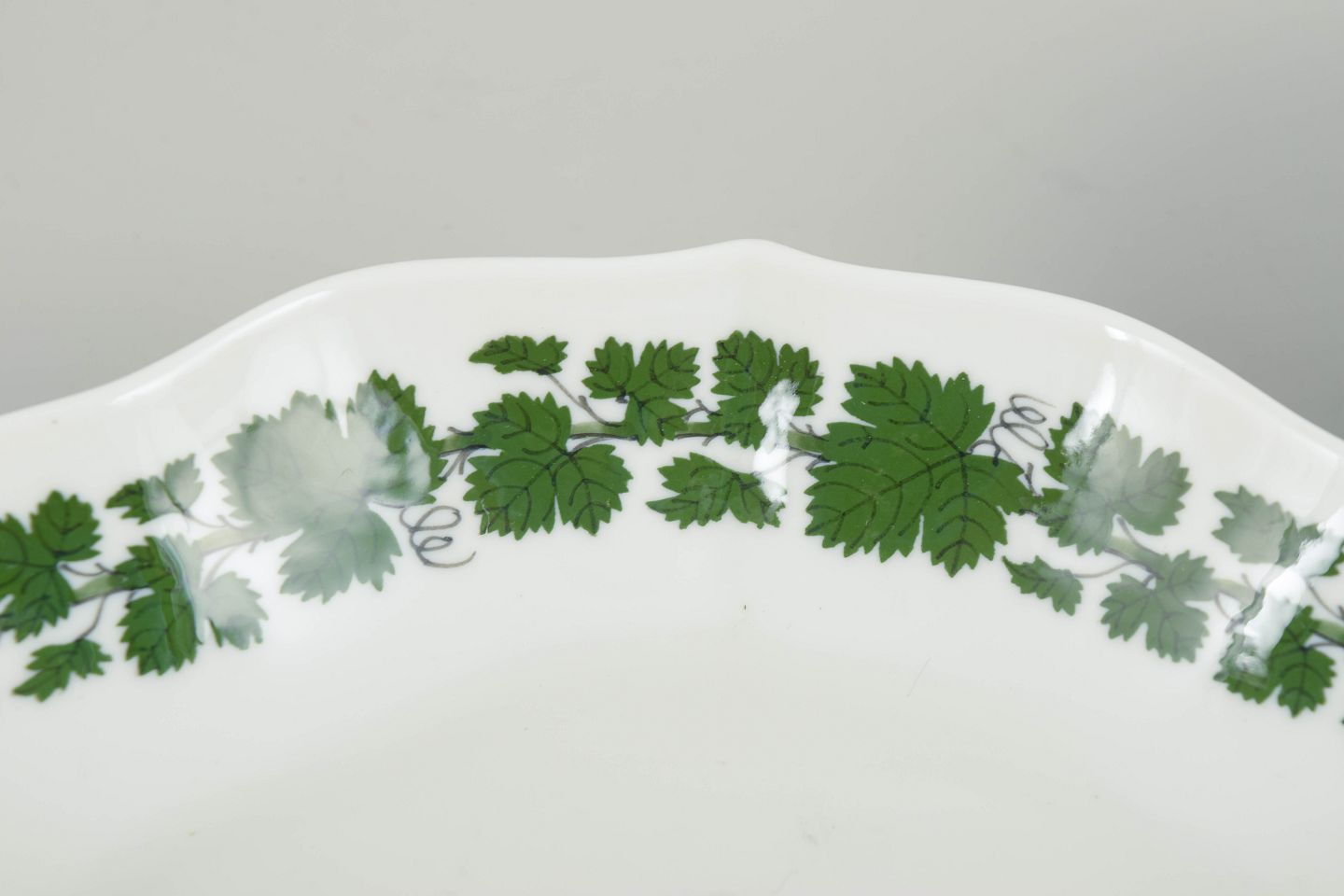 Sæt bestående af tre små serveringsfade i porcelæn med grøn vinranke- og vinløvsdekoration langs fanen; fra den grønne vinløvsserie.