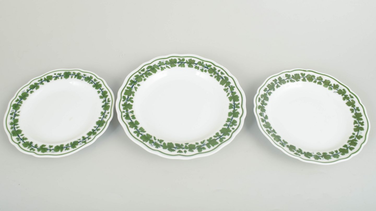 Sæt bestående af tre tallerkener i porcelæn med grøn vinranke- og vinløvsdekoration langs fanen; fra den grønne vinløvsserie.