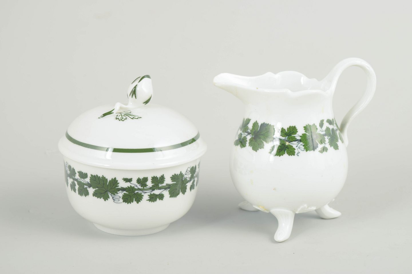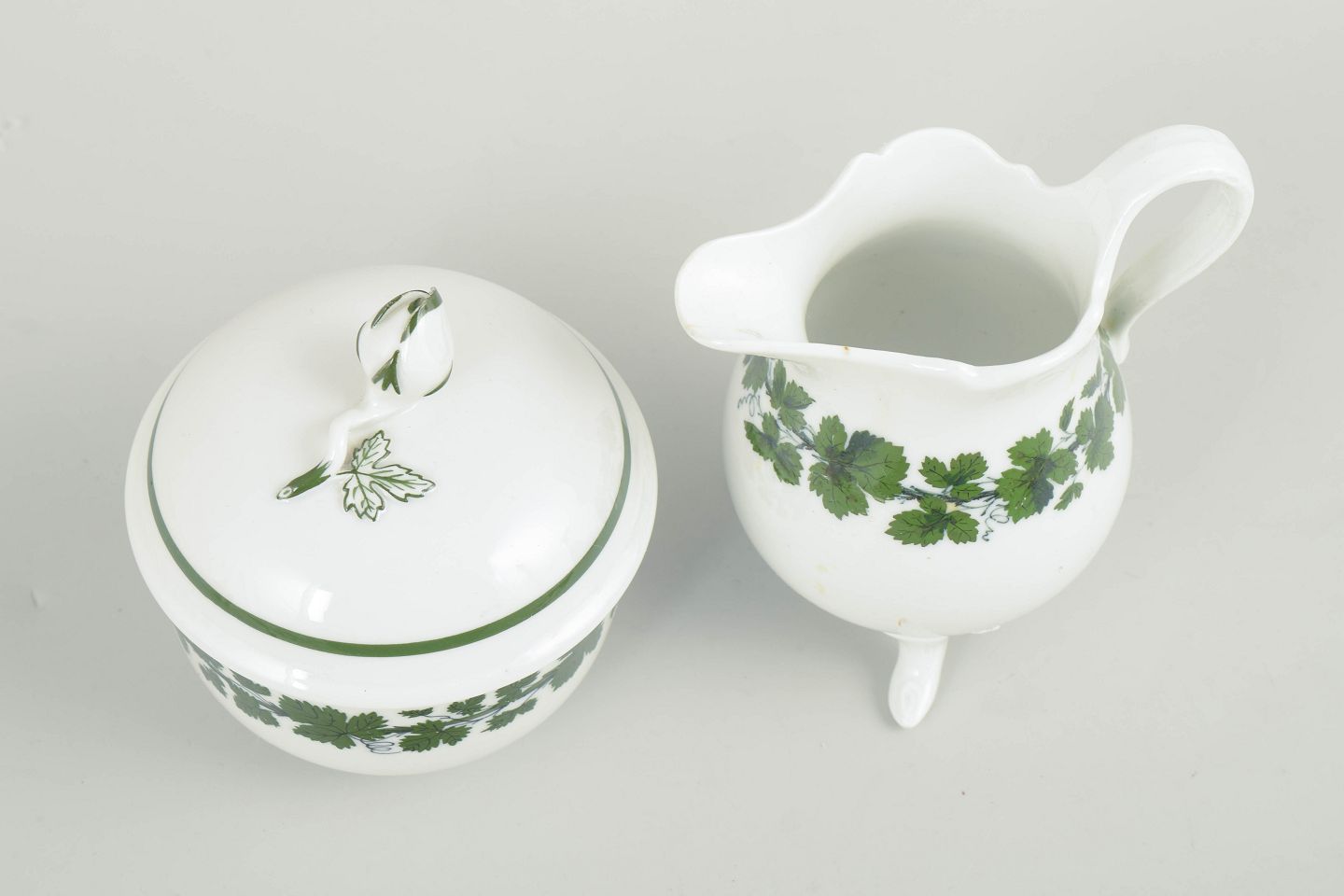 Sukker- og flødesæt i porcelæn bestående af sukkerskål med låg og flødekande, dekoreret med grøn vinranke- og vinløvsbort langs kanten; fra den grønne vinløvsserie.