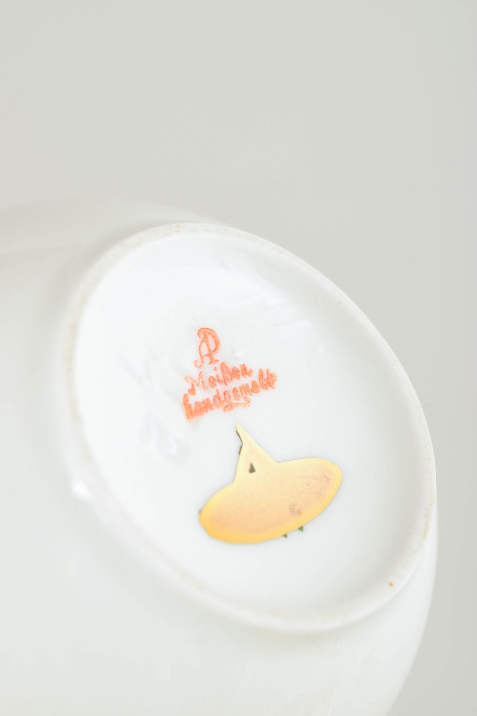 Balusterformet kande i hvidglaseret porcelæn dekoreret med rød Mingdrage og forgyldt kant. Modellen er fremstillet i Meissen-området og er ikke produceret af den kongelige Meissen-manufaktur.