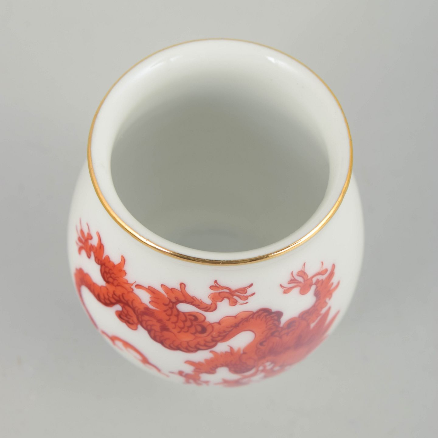 Lille balusterformet vase i hvidglaseret porcelæn dekoreret med rød Mingdrage og forgyldt kant. Modellen er mærket under bunden og er produceret i Meissen-området, men ikke af den kongelige Meissen-manufaktur.