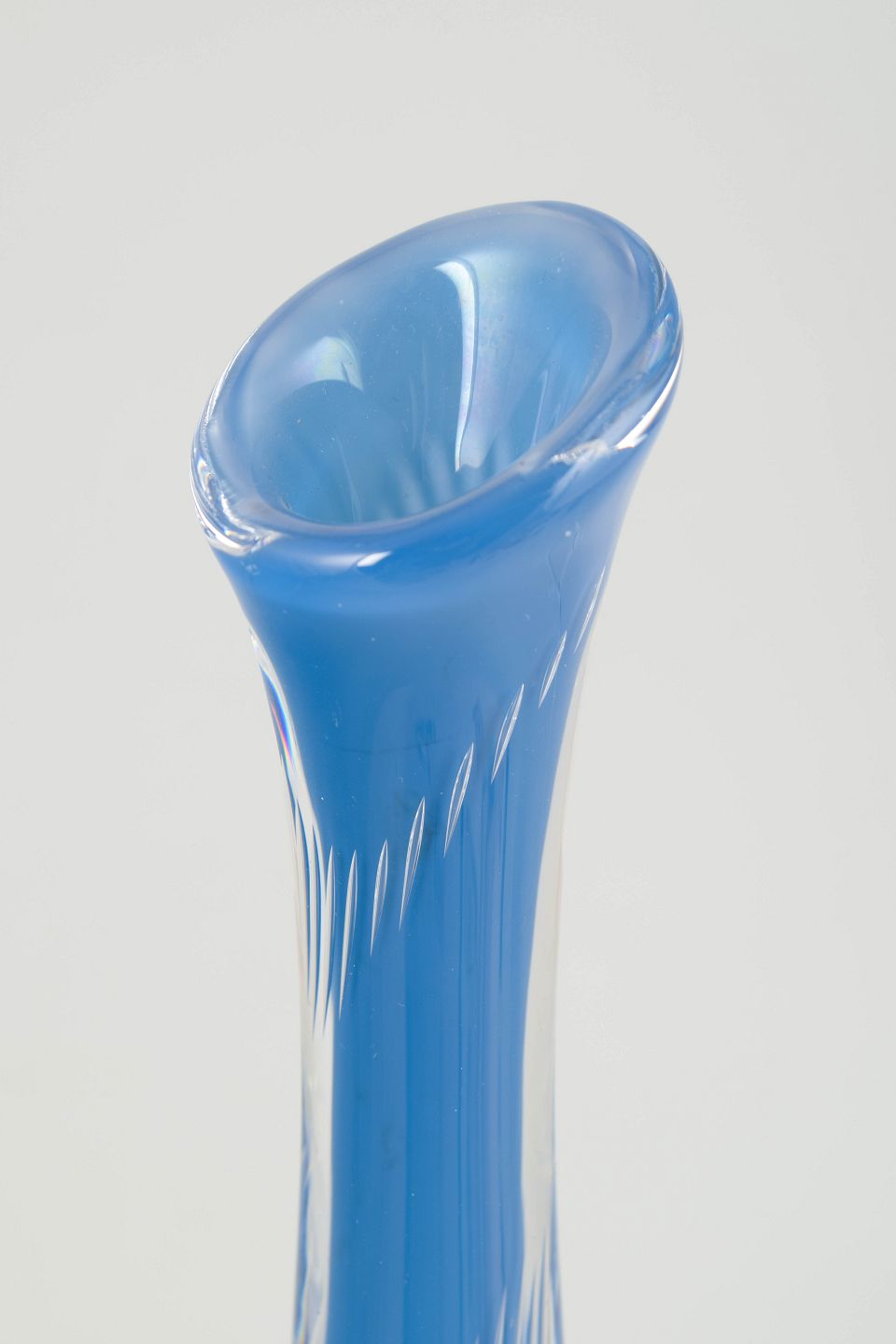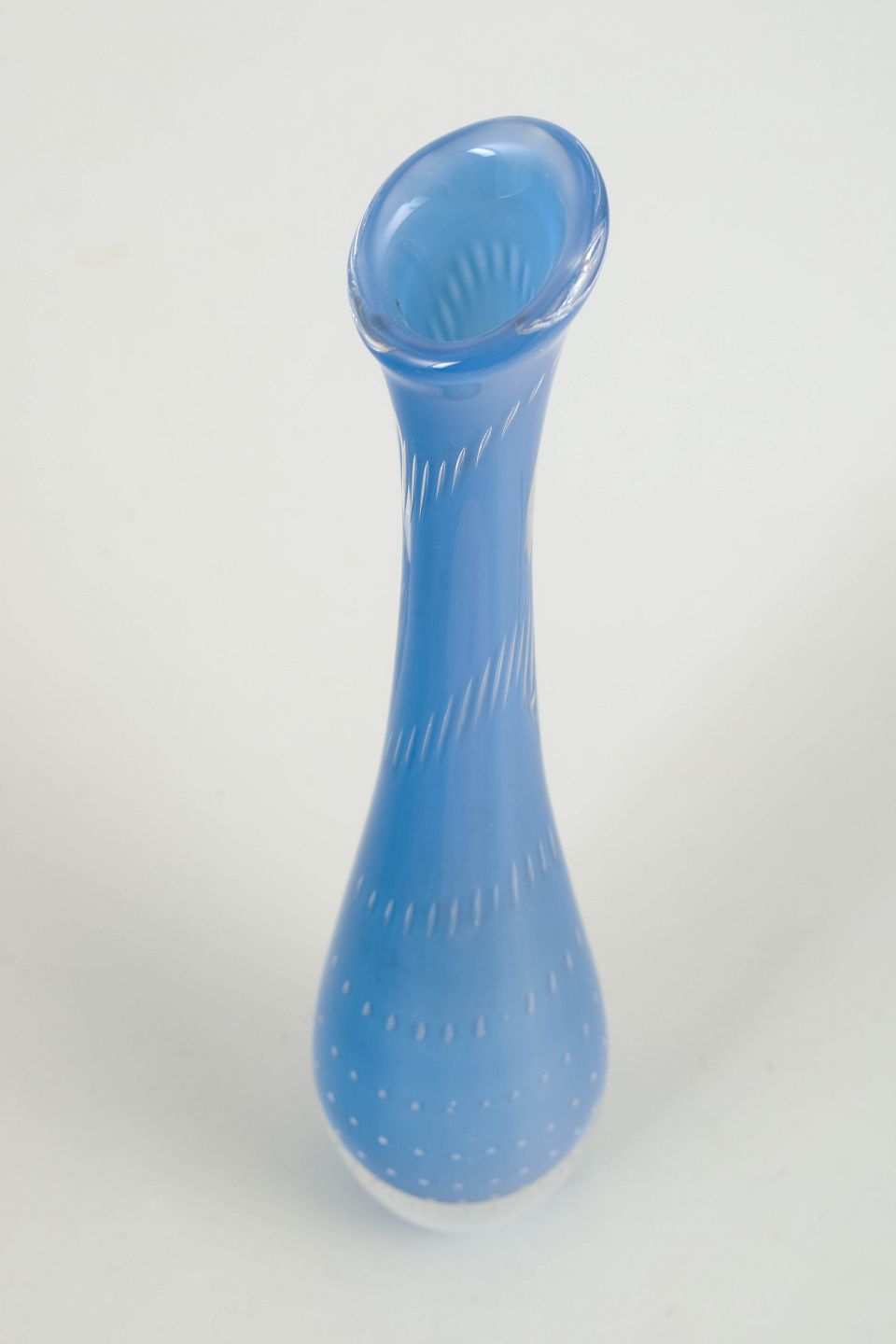 Slank vase i blåt kunstglas med dekorativt boblemønster og optisk ribning; indridset i bunden “LH 1336 / Kosta”.