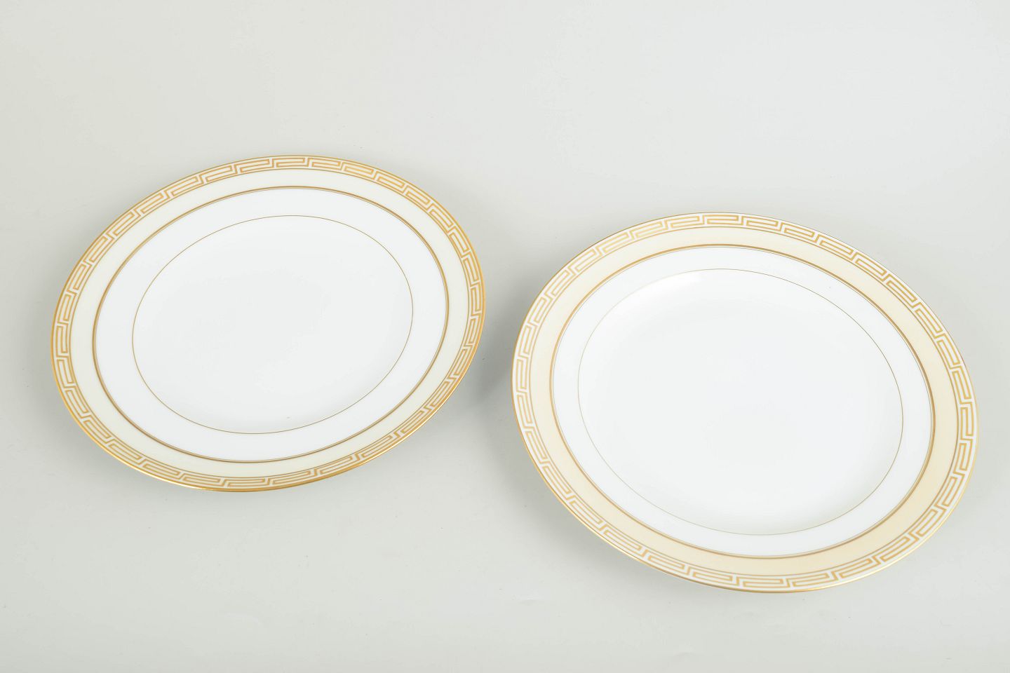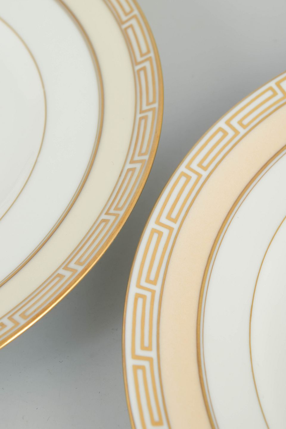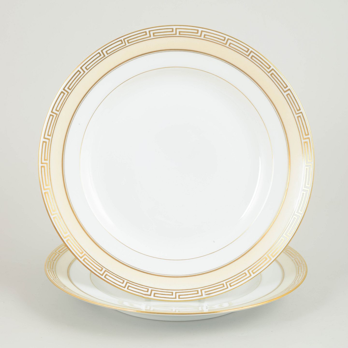 Sæt med to hvide porcelænstallerkener med forgyldt kant og geometrisk bort, udført i en stram art deco-inspireret stil; model 25.