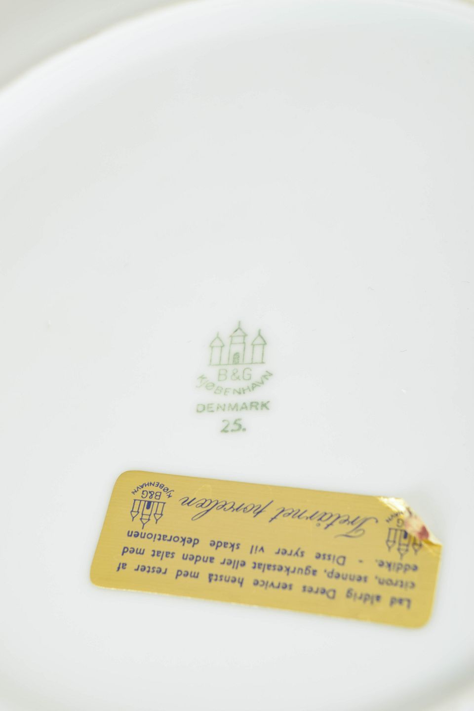 Bing & Grøndahl var i mellemkrigstiden kendt for elegante bordservicer, hvor klassiske elementer blev fortolket i tidens mere geometriske og stilrene formsprog. Den forgyldte bort og den tydelige, grafiske opbygning er karakteristisk for 1920’ernes art deco-æstetik og giver et raffineret, formelt udtryk på bordet.