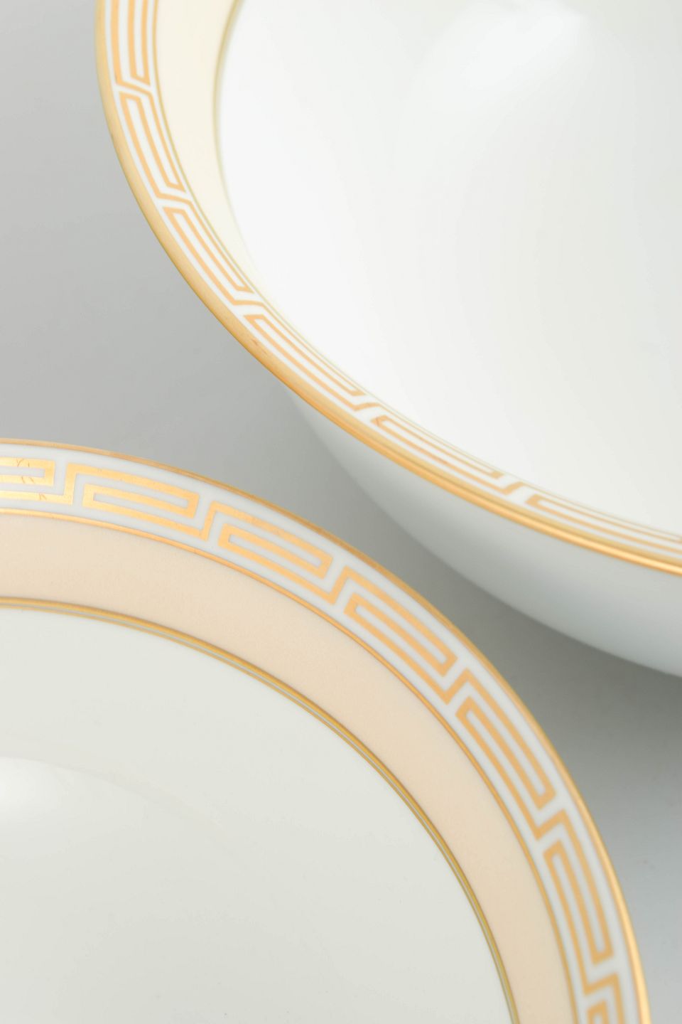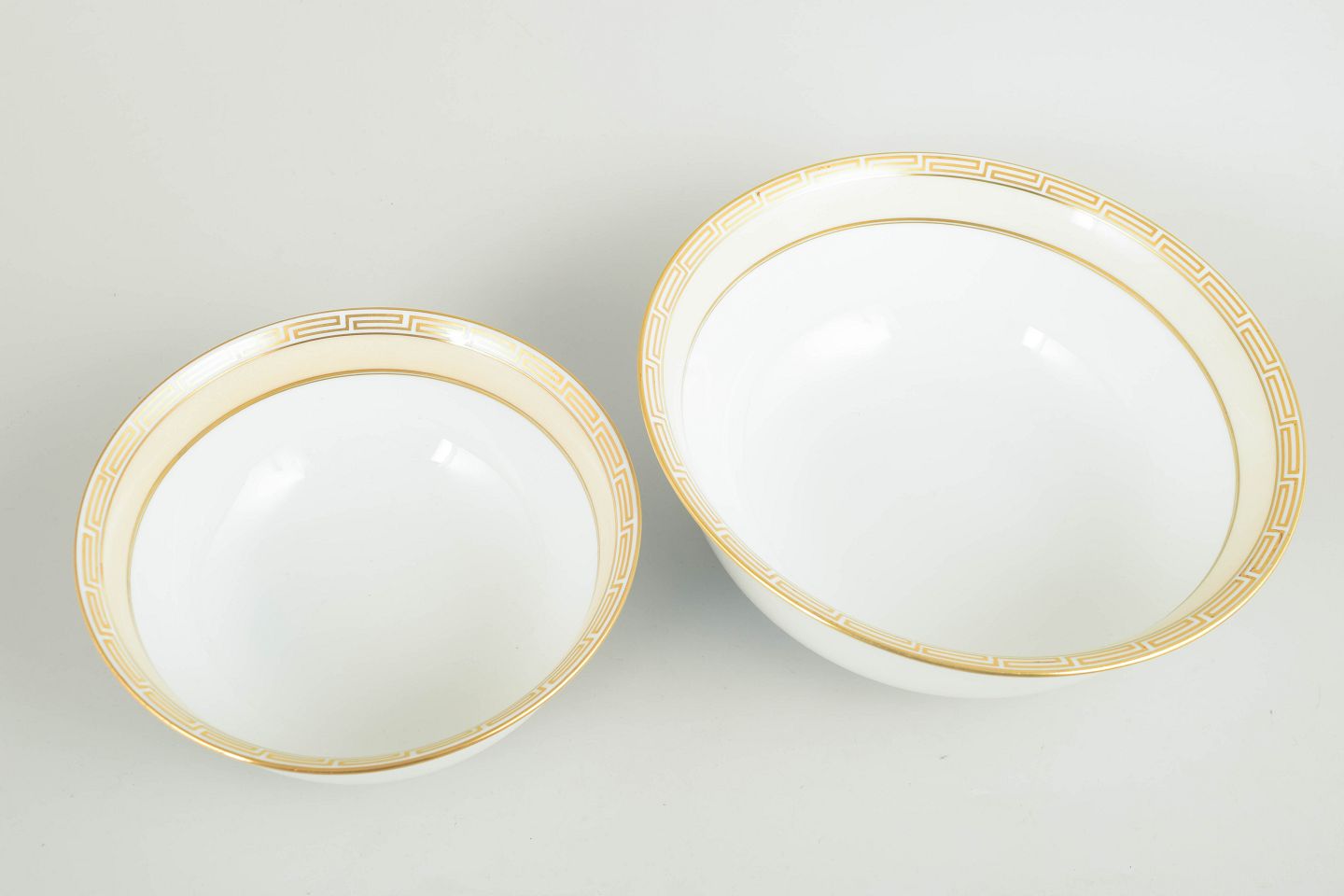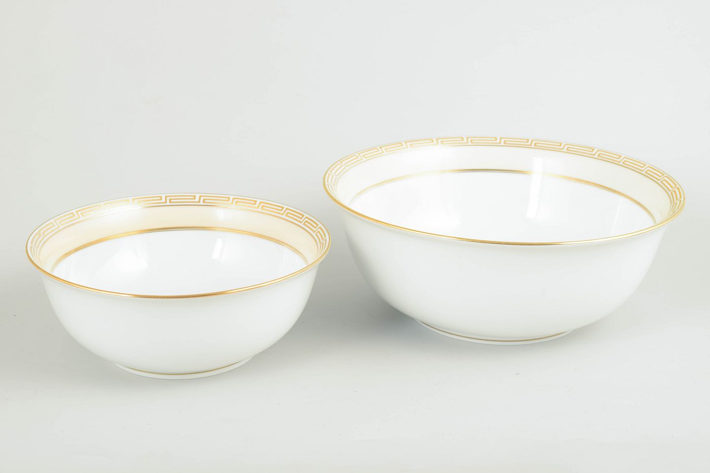 To skåle i hvidglaseret porcelæn med forgyldt geometrisk bort i klassisk Art Deco-stil langs randen.