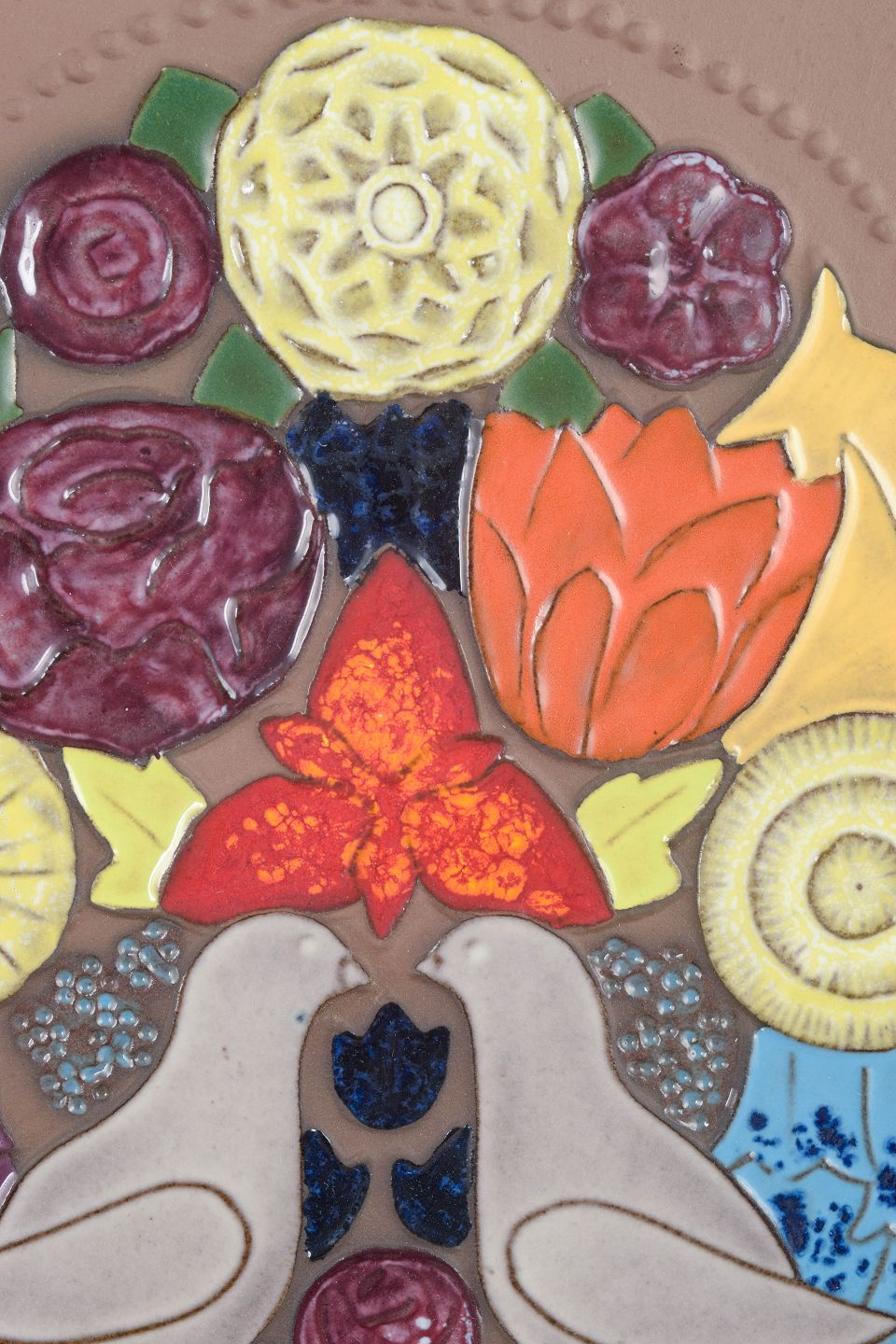 Farverigt keramisk vægrelief med stiliseret blomsterbuket og to fugle i relief. Modelnr. 01945.