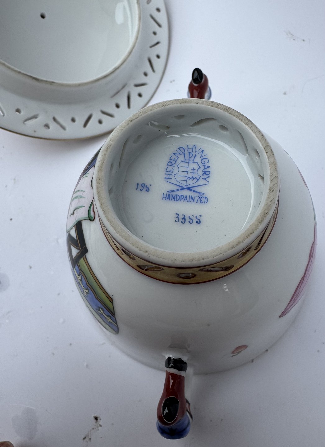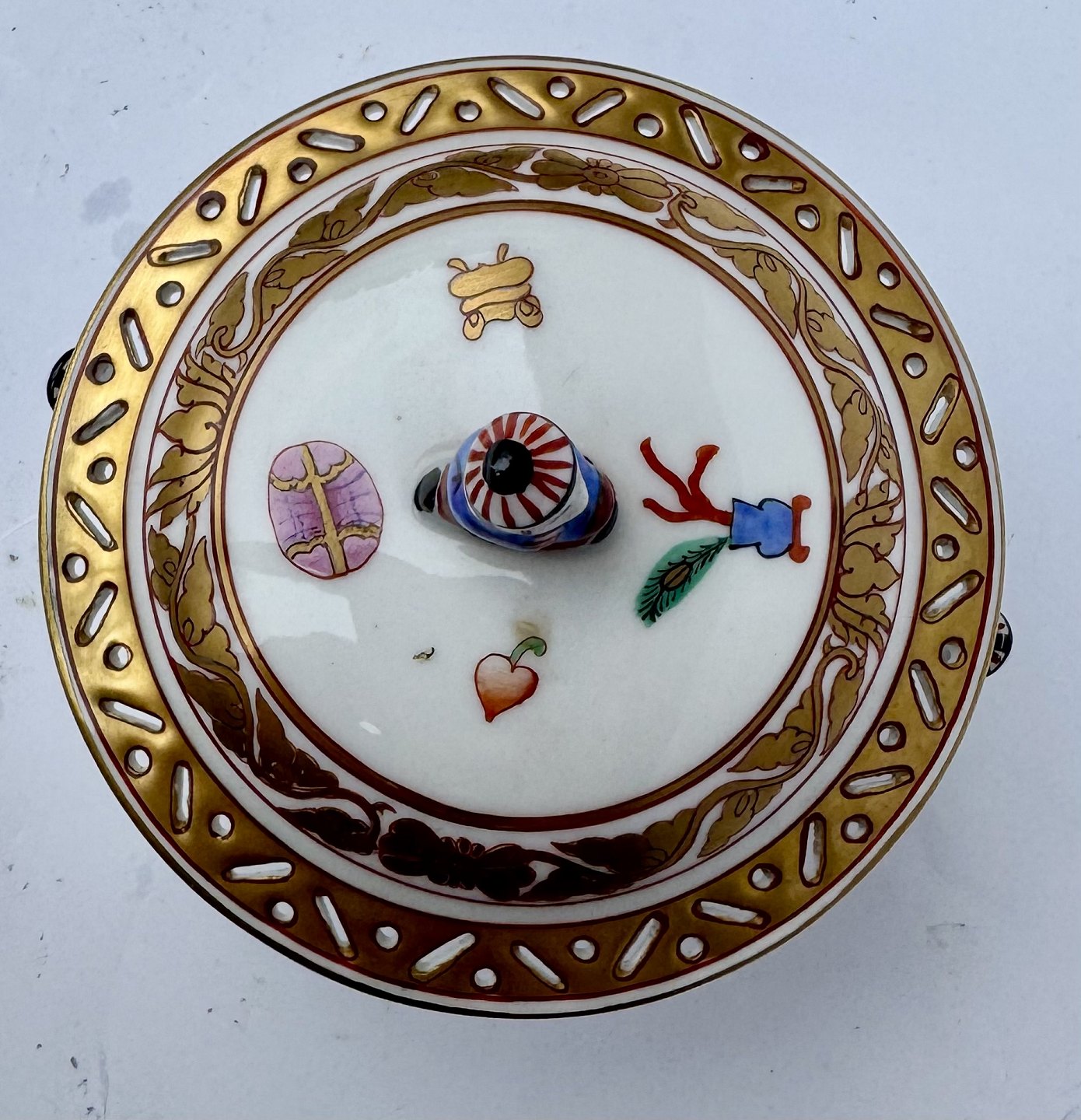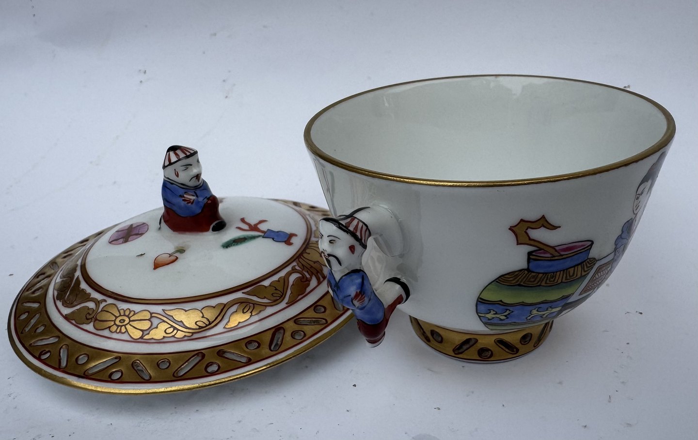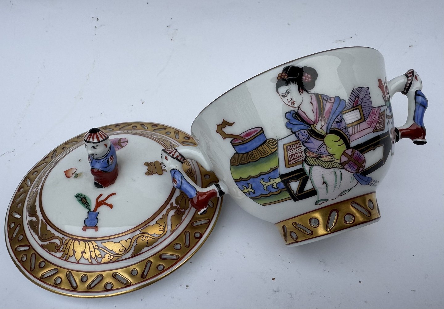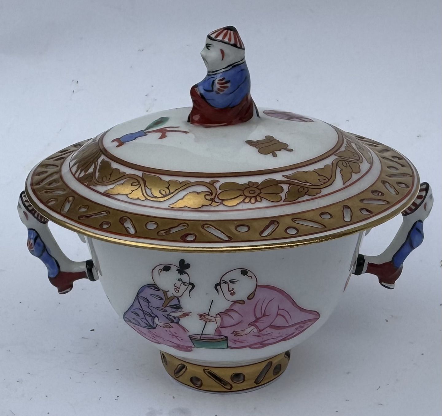 Herend lågskål i porcelæn fra Ming serien. Delikate kinesiske bemalede dekorationer samt figurer. Gennembrudte kanter. I perfekt stand. Fremstillet på den ungarnske porcelænsfabrik Herend i 1930’erne. Mål: H. 8,5 cm. Fra øre til øre 9,3 cm. Lågets diameter 8,6 cm. Bundens diameter 3,2 cm