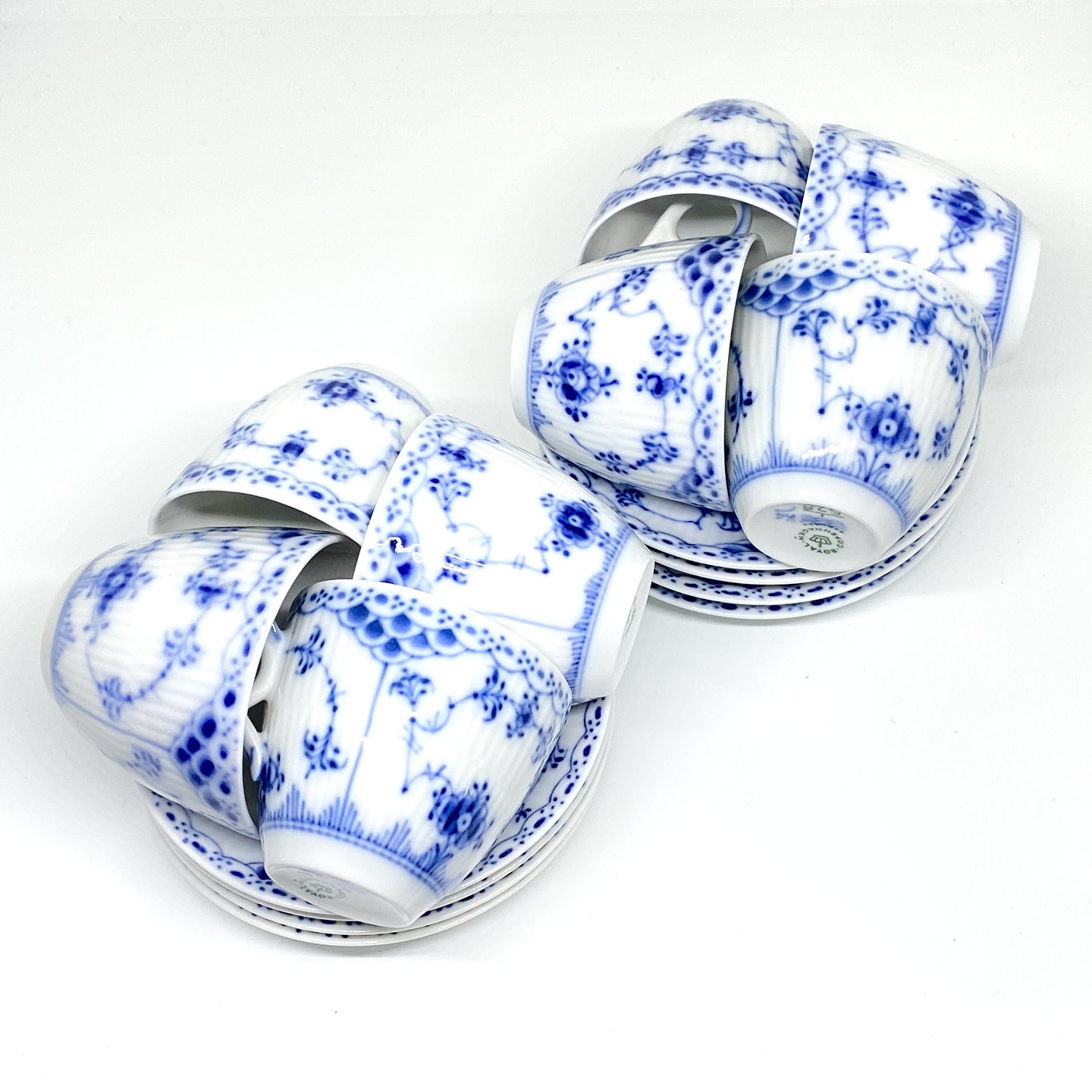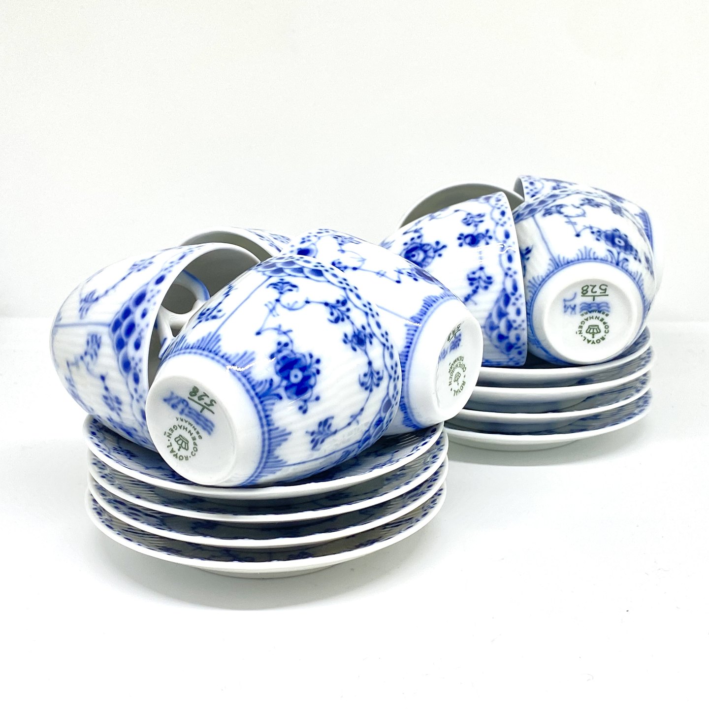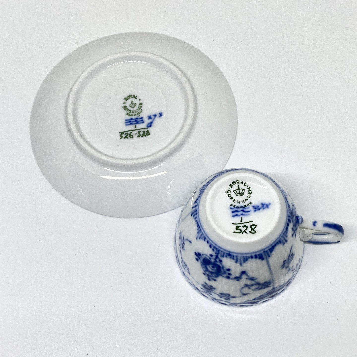 Text zugänglich auf Dänische: Royal Copenhagen/Kgl Musselmalet halvblonde kaffekop og underkop.
