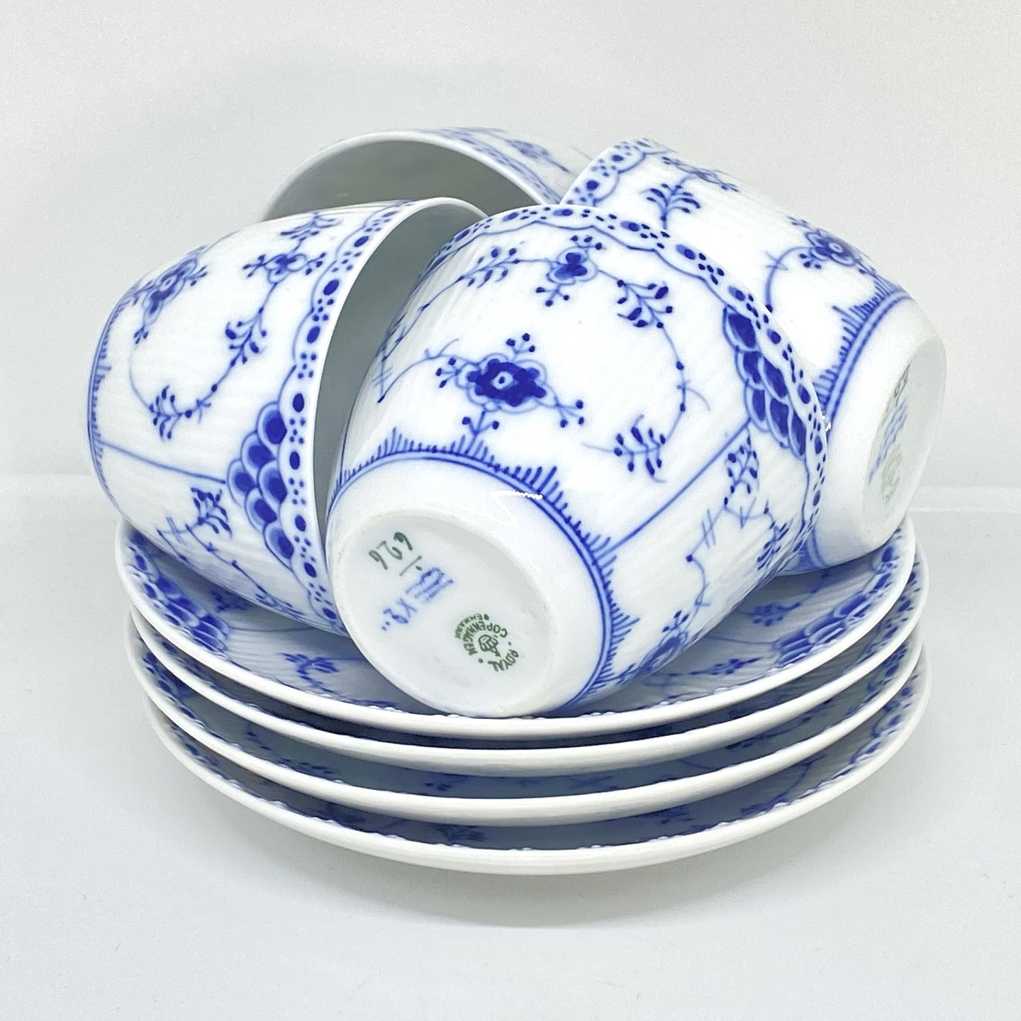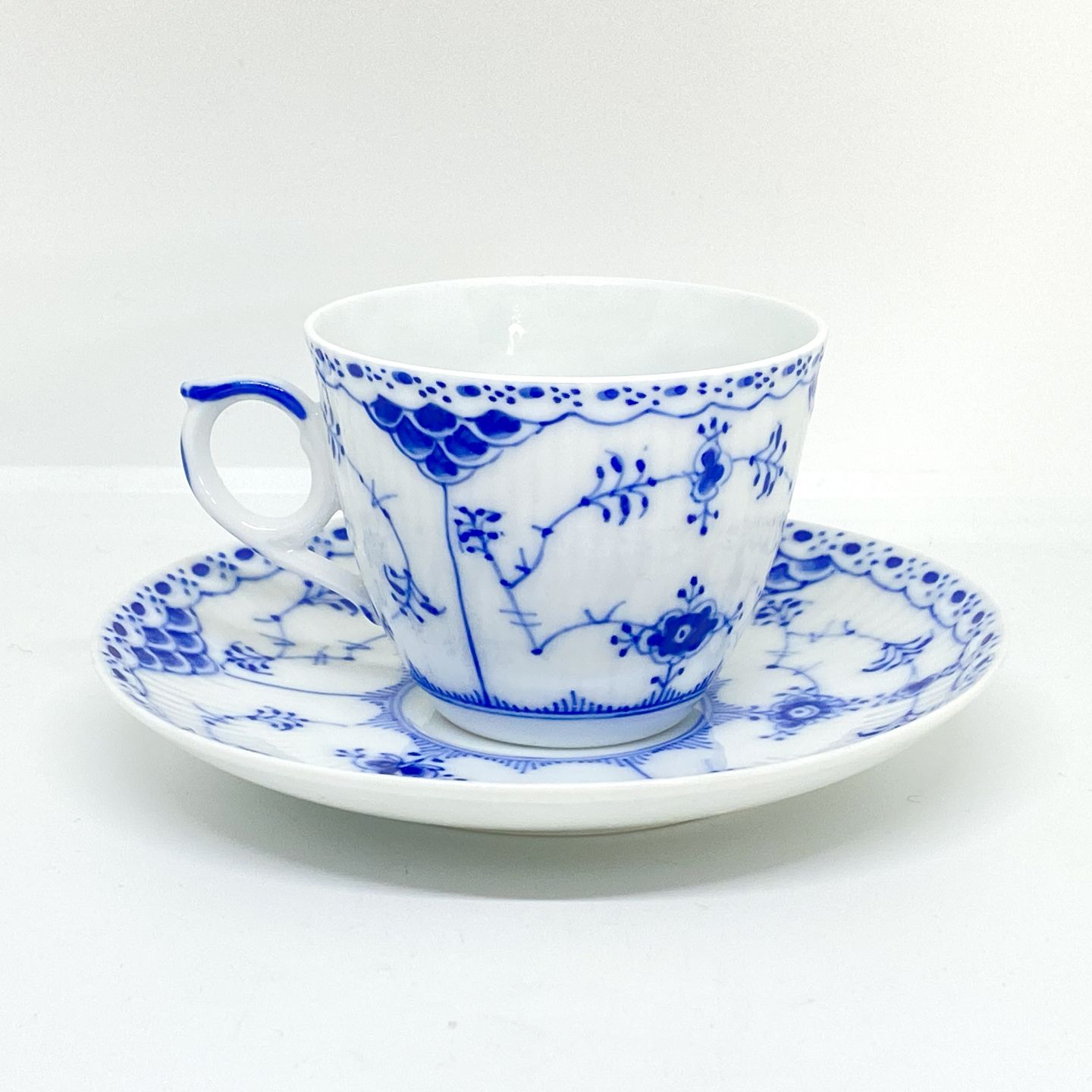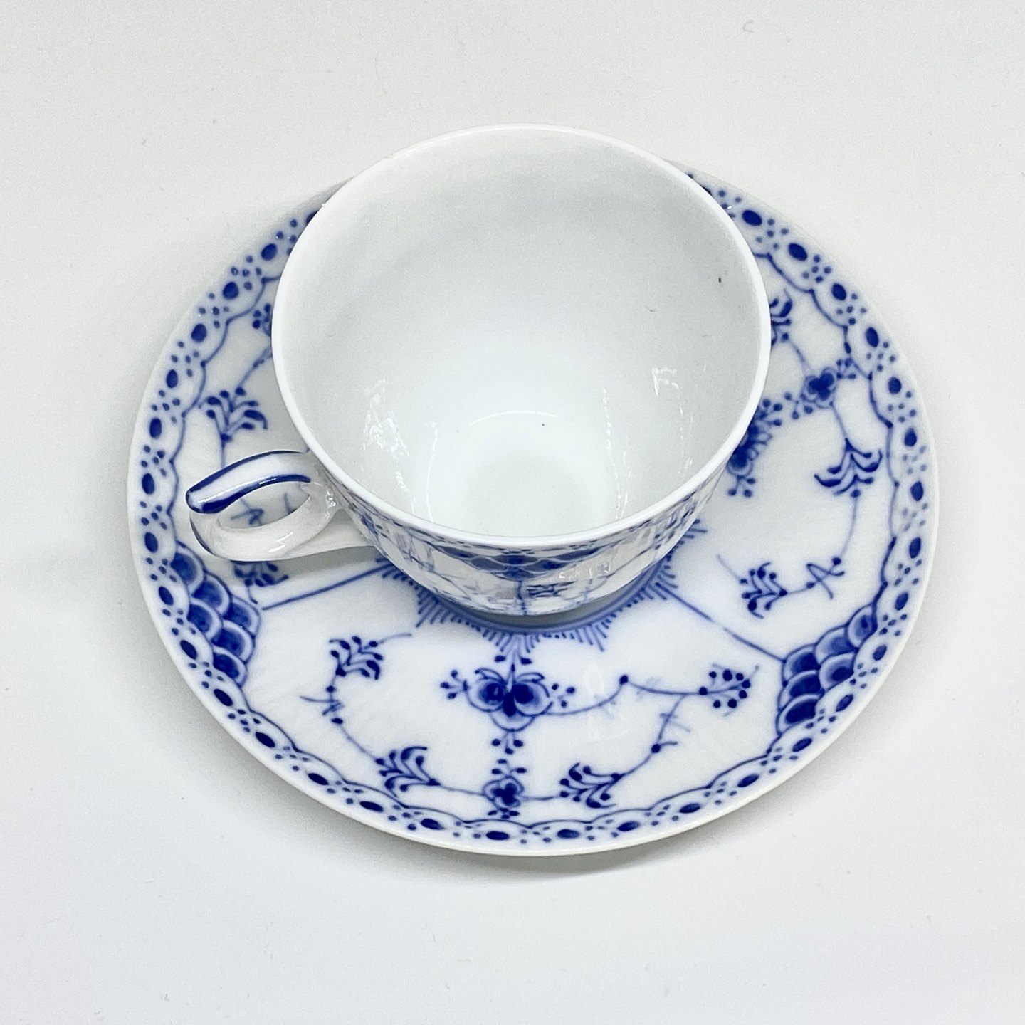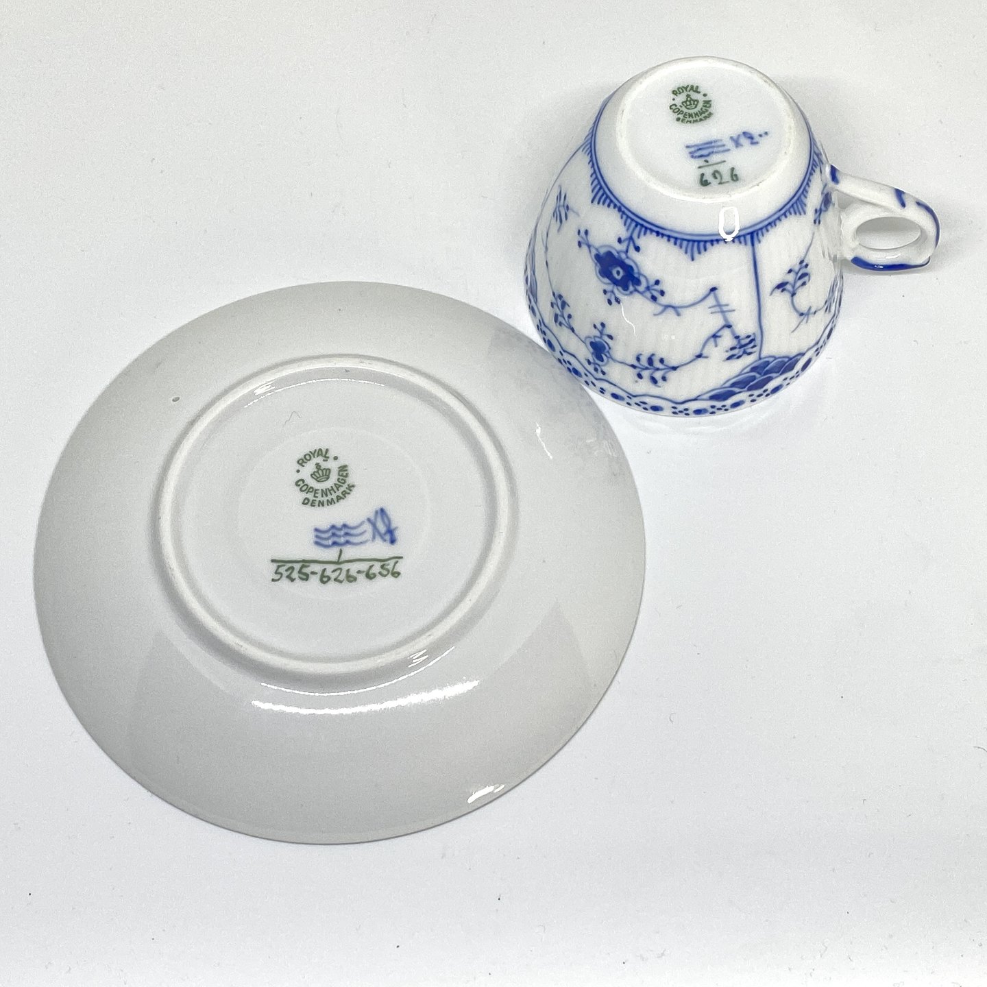 Text zugänglich auf Dänische: Royal Copenhagen/Kgl Musselmalet halvblonde kaffekop og underkop.