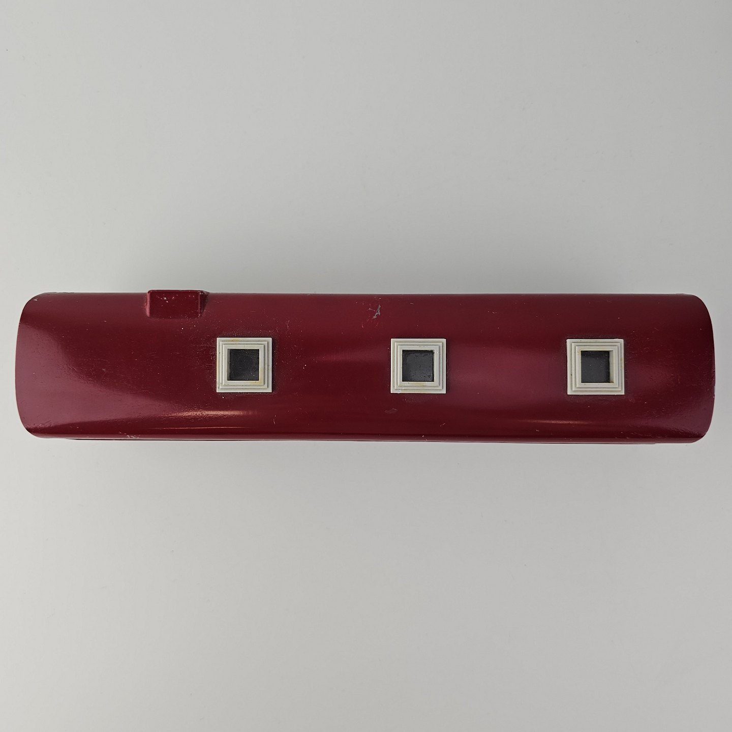 Legetøjsbil. Rødmalet DSB bus, Scania CR-76 med reklamer, chauffør og en baglåge, der kan åbnes
