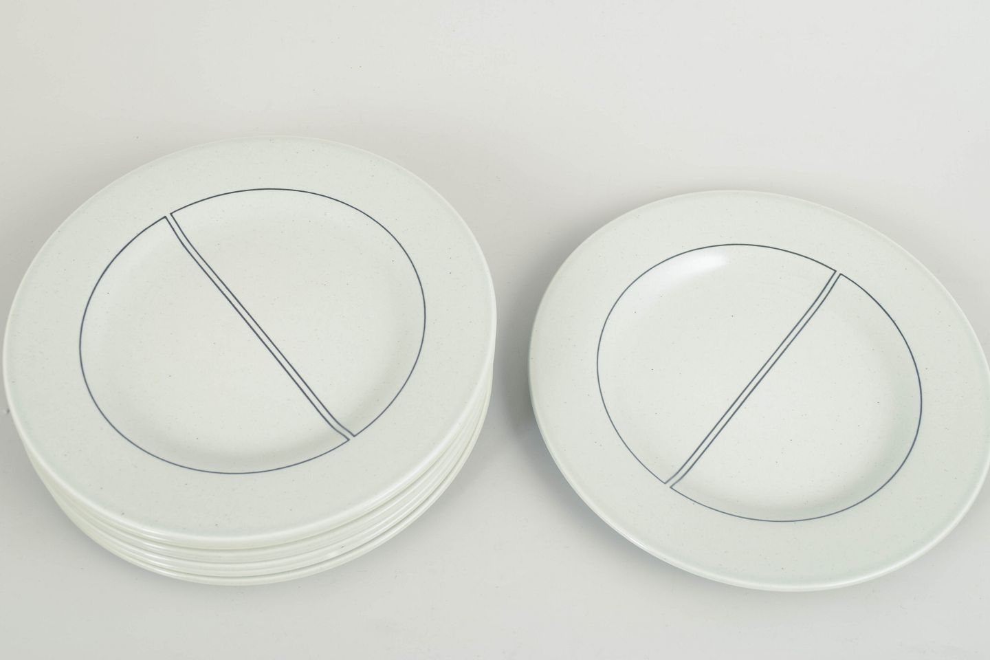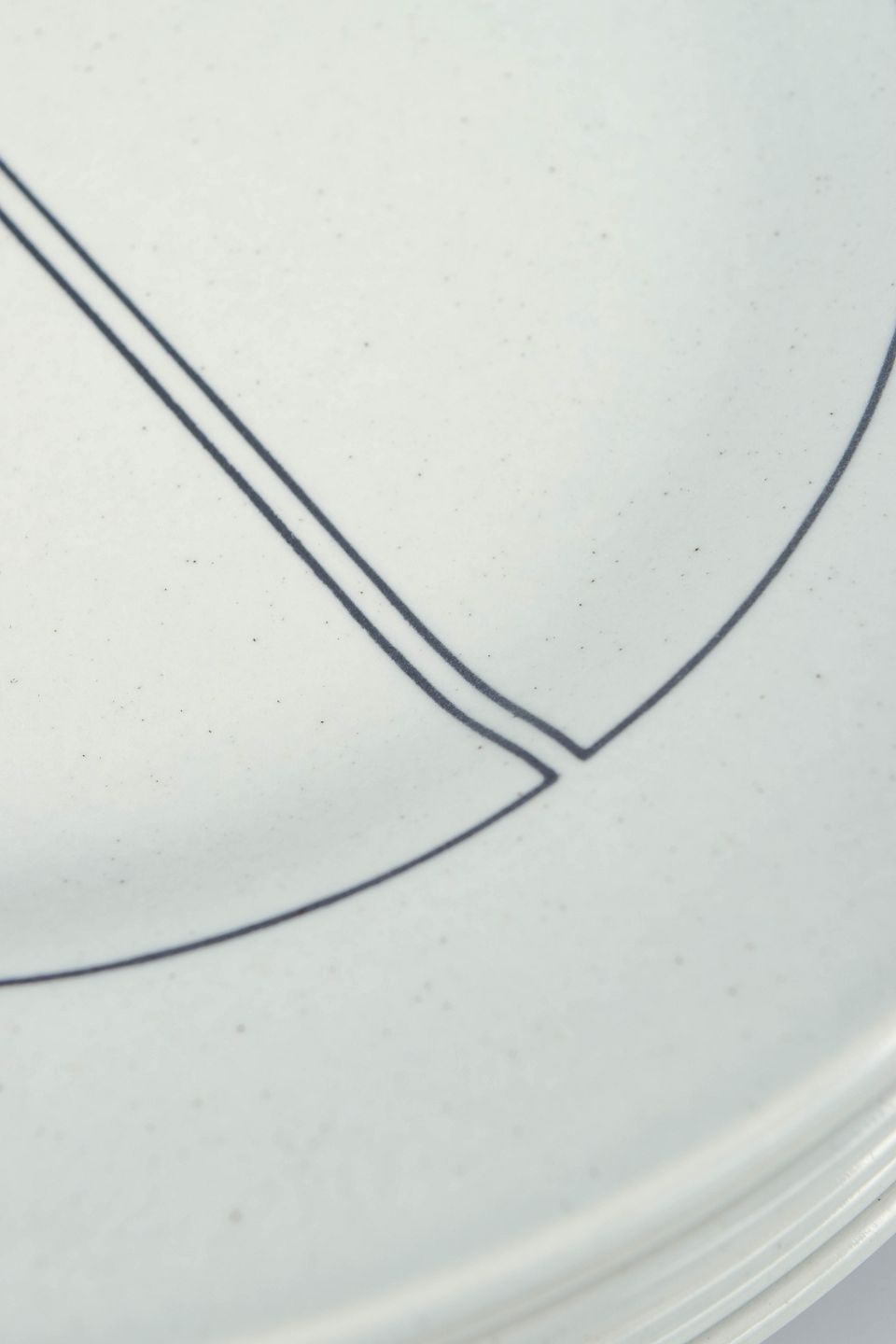Flade tallerkener i fajance med hvid glasur og grafisk dekoration med sort cirkel og skrå linje, udført i modellen “Demi”.