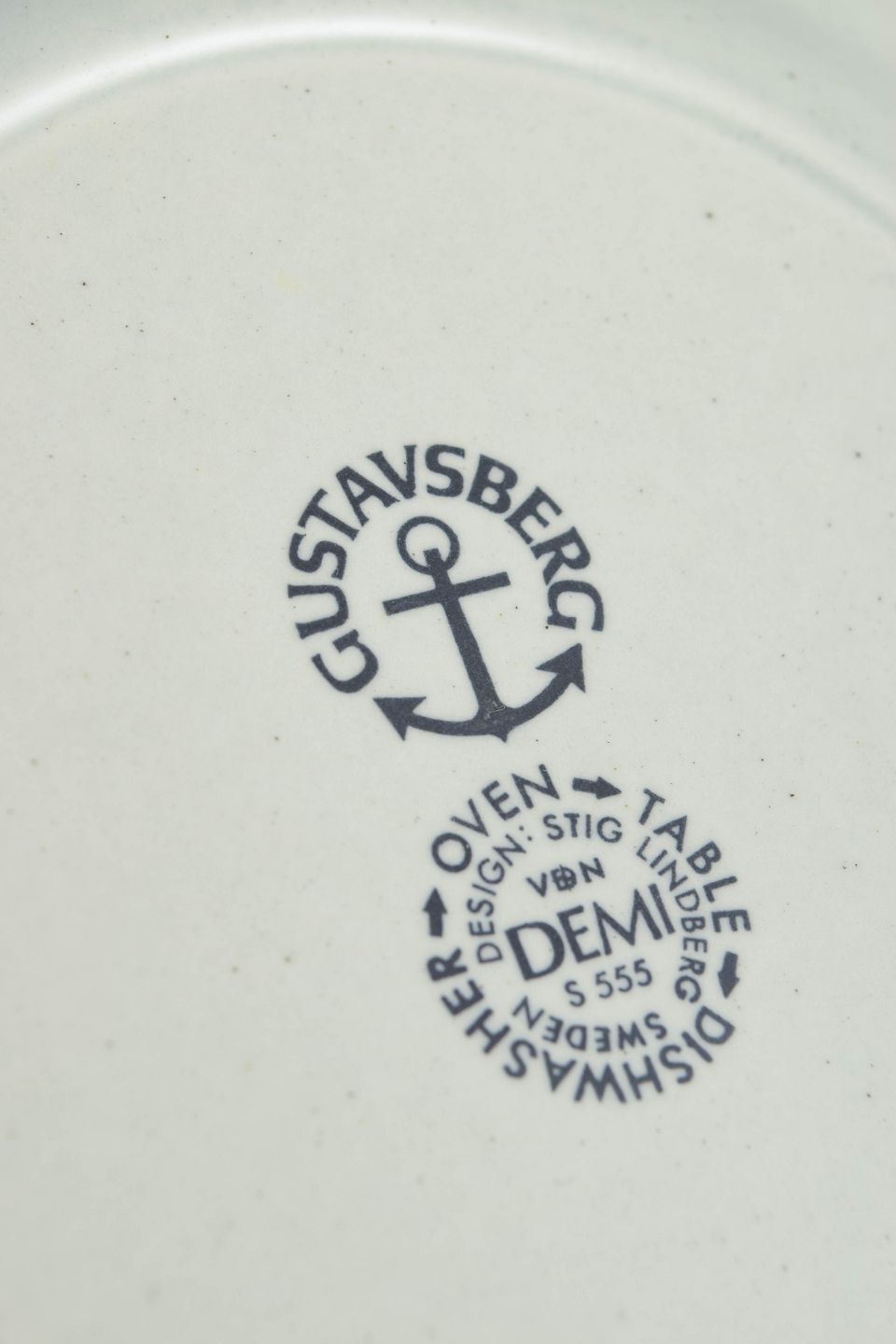 Stig Lindberg var en af Gustavsbergs mest markante designere og en hovedfigur i svensk modernistisk formgivning. I 1950’erne og 60’erne udviklede han enkle serviceformer med klare geometriske dekorationer, hvor funktion og visuel identitet gik hånd i hånd. “Demi”-modellen repræsenterer denne tilgang med sit stramme formsprog og diskrete grafiske mønster.