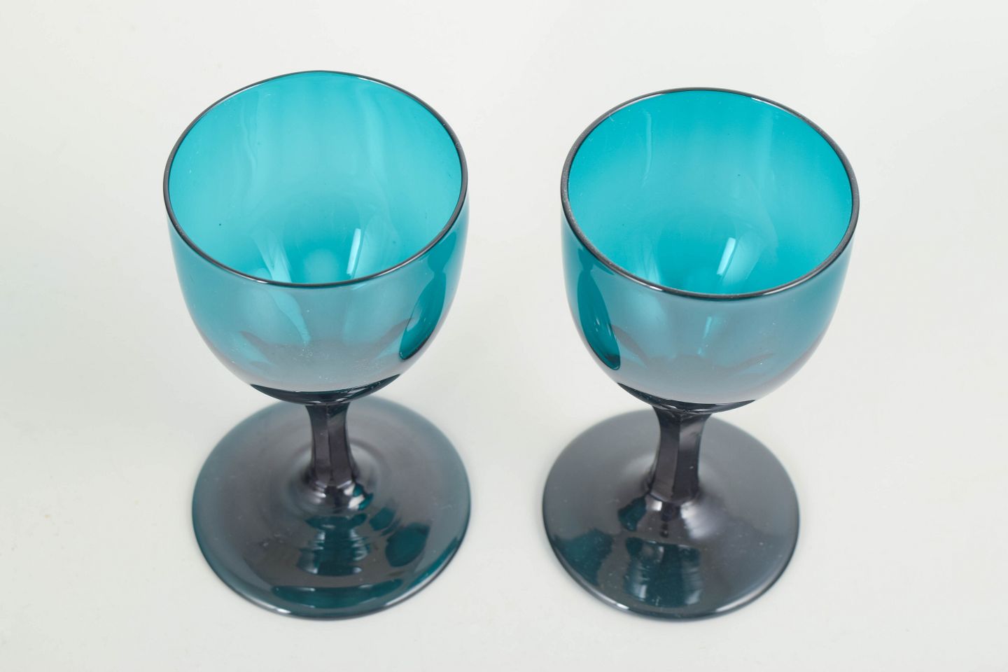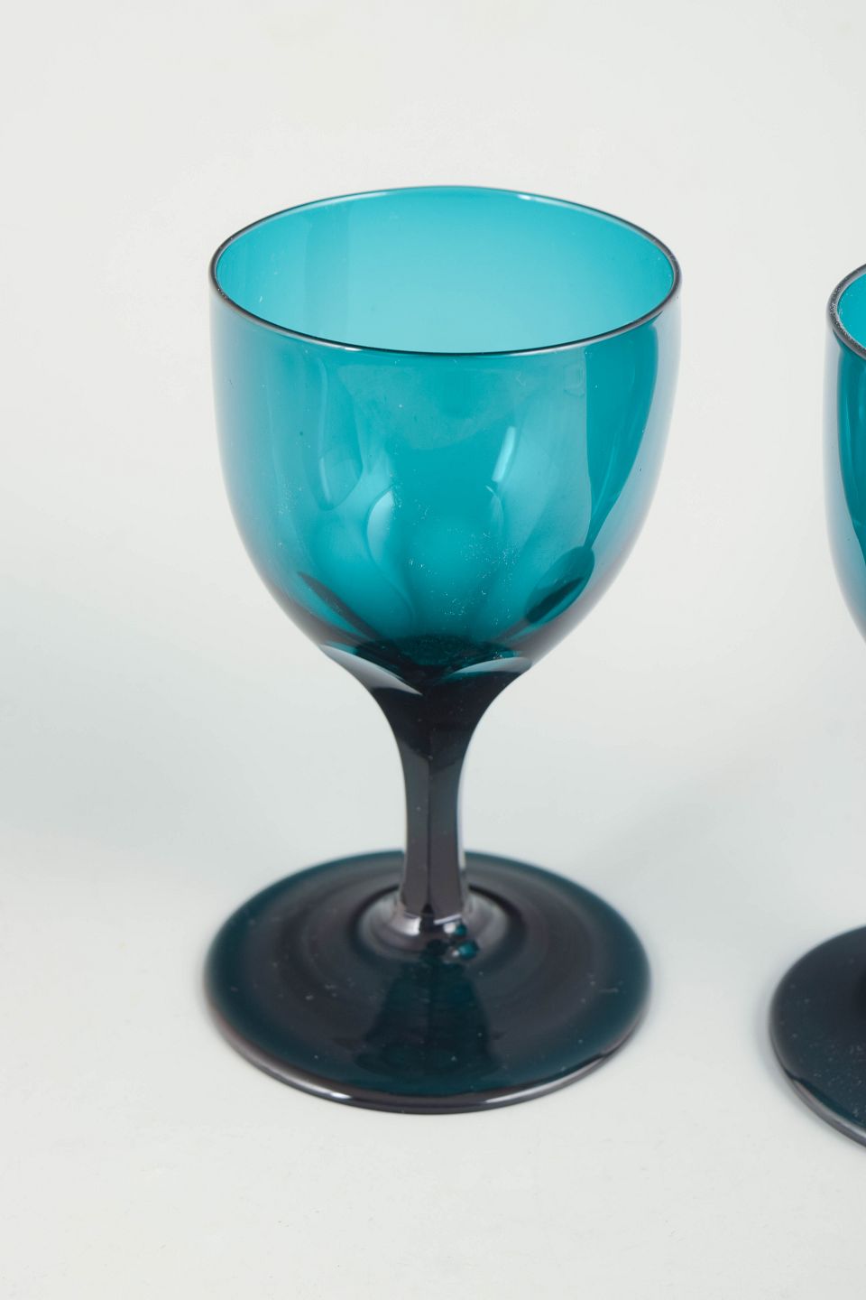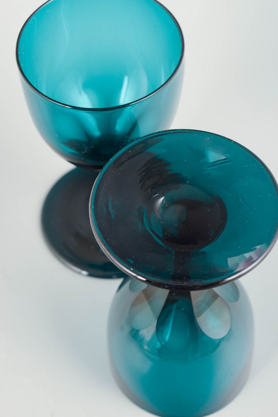 To hvidvinsglas i krystalglas med petrolblå kumme og mørkere, facetslebet stamme og fod.