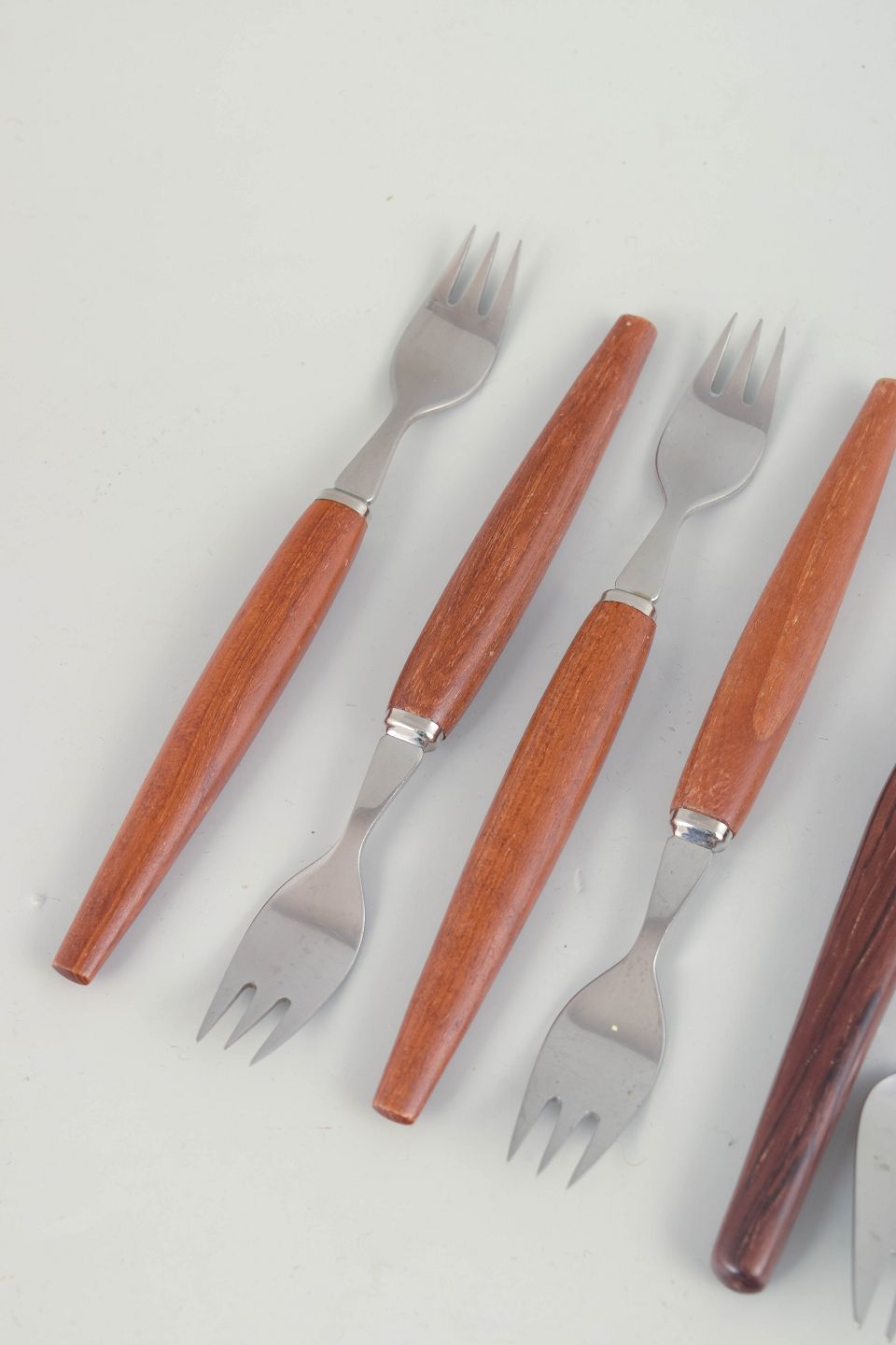 Komplet sæt frokostbestik, svensk design fra ca. 1960’erne med skafter i teak. Sættet består af 4 frokostknive, 4 frokostgafler og 4 pålægsgafler i et enkelt og funktionelt modernistisk formsprog.