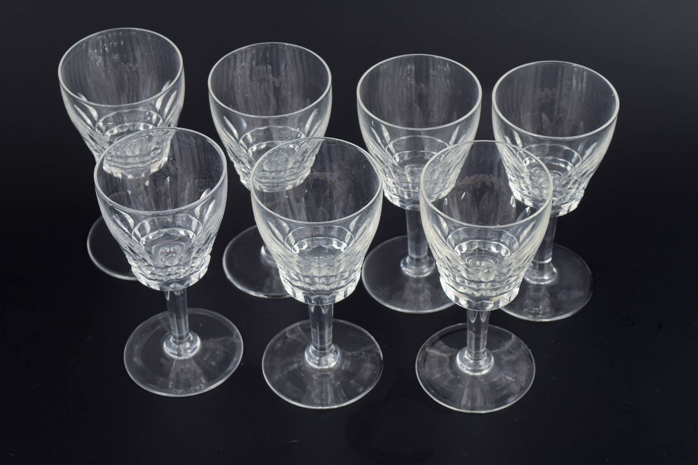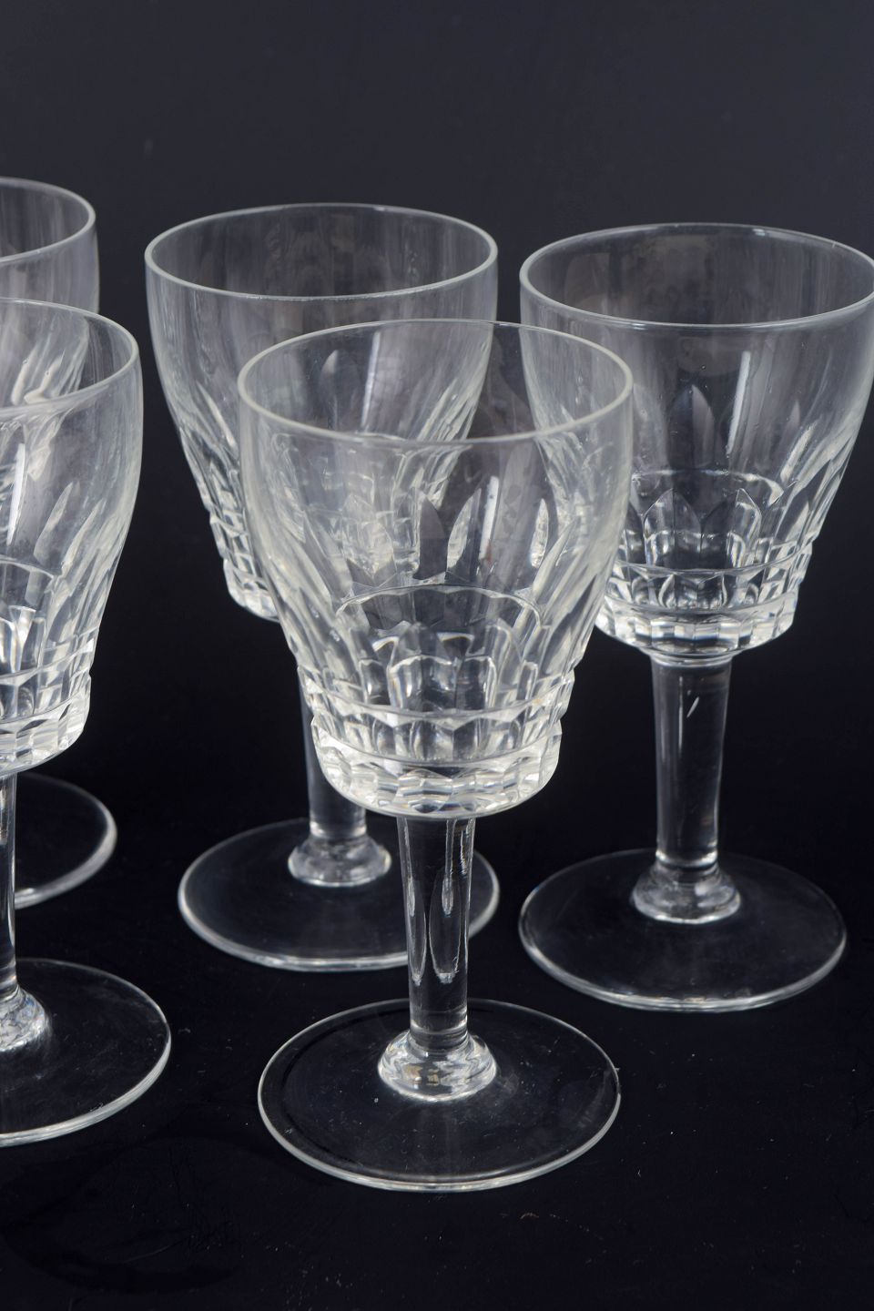 Sæt med syv franske portvinsglas i klart krystal med facetteret kumme og klassisk stamme. Form og slibning giver et elegant lysspil og et tidstypisk udtryk fra midten af det 20. århundrede.