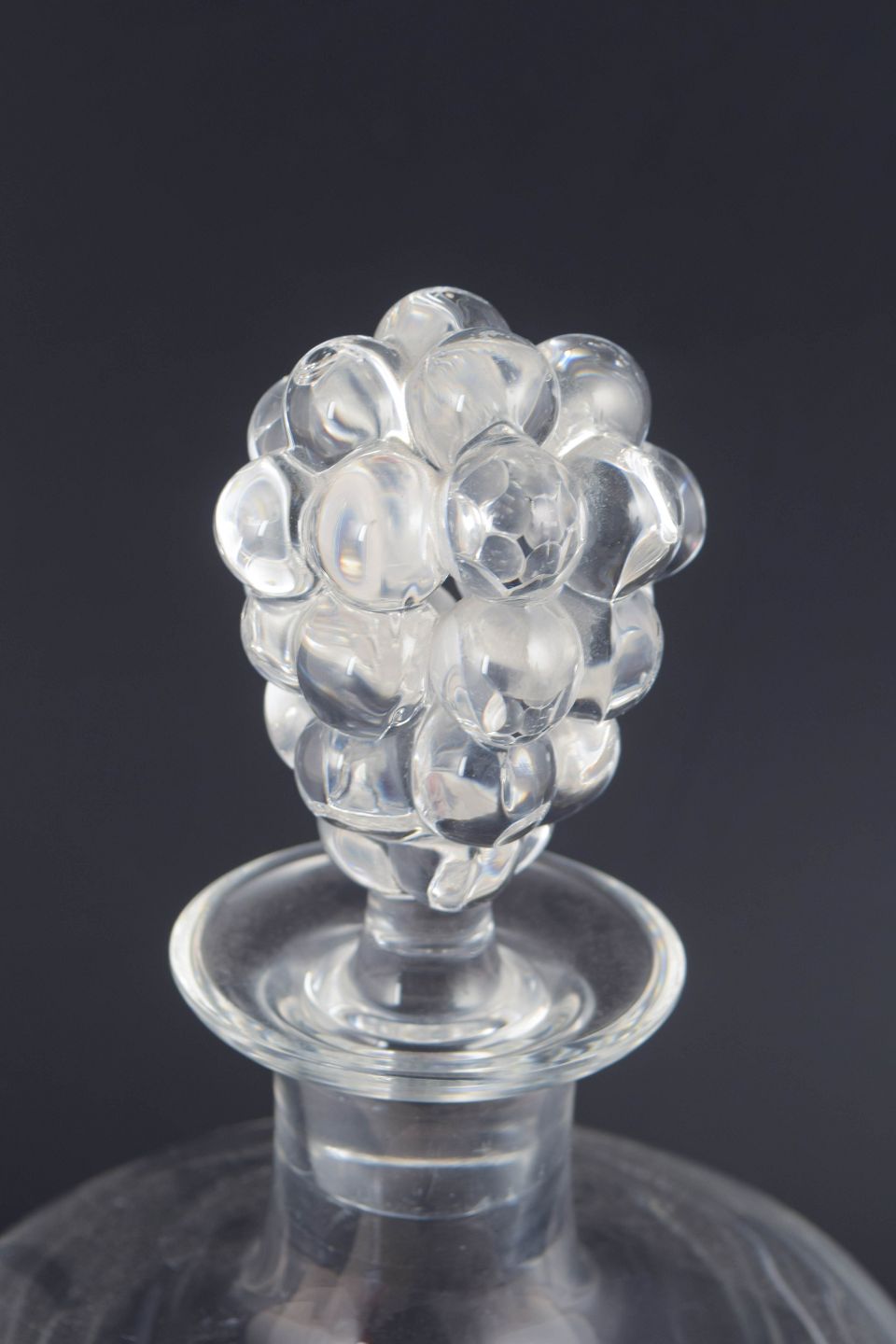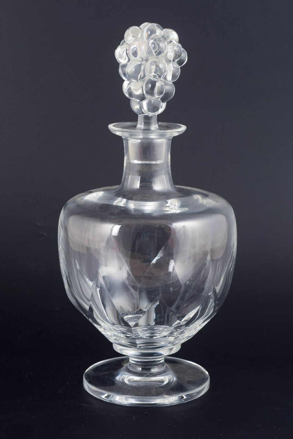 Stor og sjælden vinkaraffel i klart formpresset glas med reliefsleben korpus og knop formet som drueklase. Modellen “Clos Vougeot” er udført med klassisk Art Deco-inspireret symmetri og elegante facetter, der reflekterer lyset og fremhæver glassets klarhed. Signeret i bunden.
