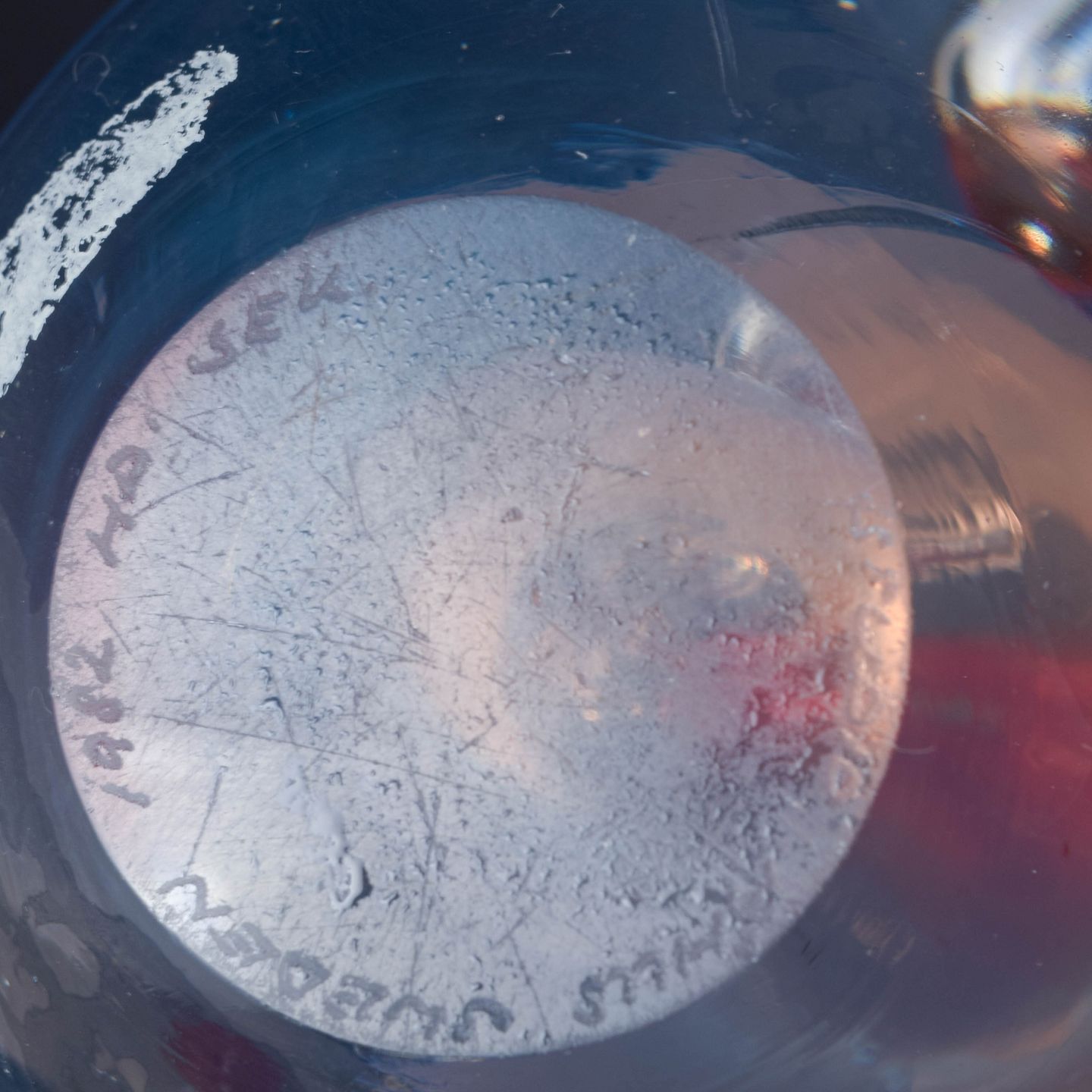 Svensk studioglas fra den sene del af det 20. århundrede er ofte kendetegnet ved eksperimenter med optiske effekter, indkapslede farveelementer og skulpturelle, frie former. Kombinationen af klart glas og kontrastfulde farveindlæg fremhæver materialets transparens og giver et markant spil mellem lys, rum og dybde.