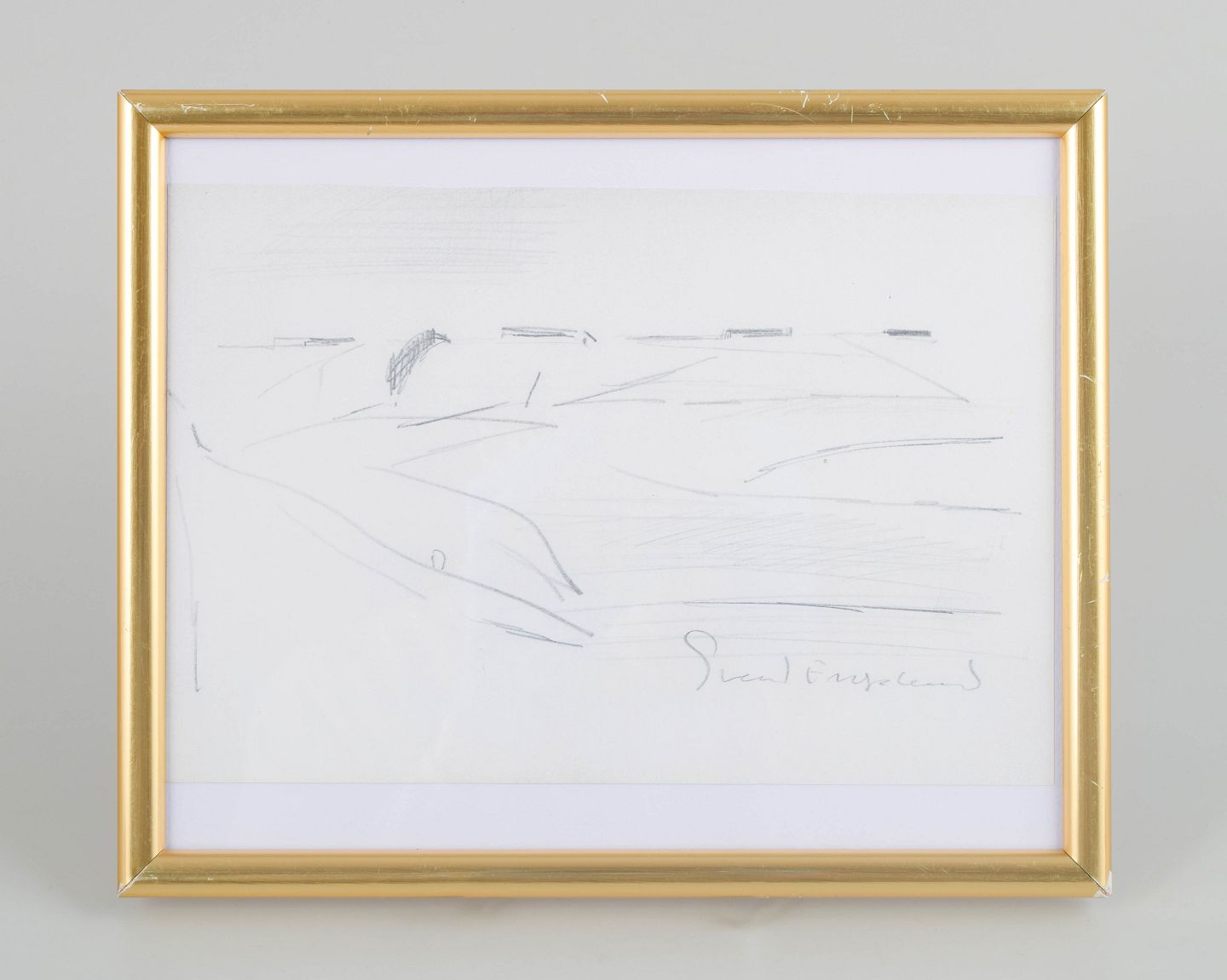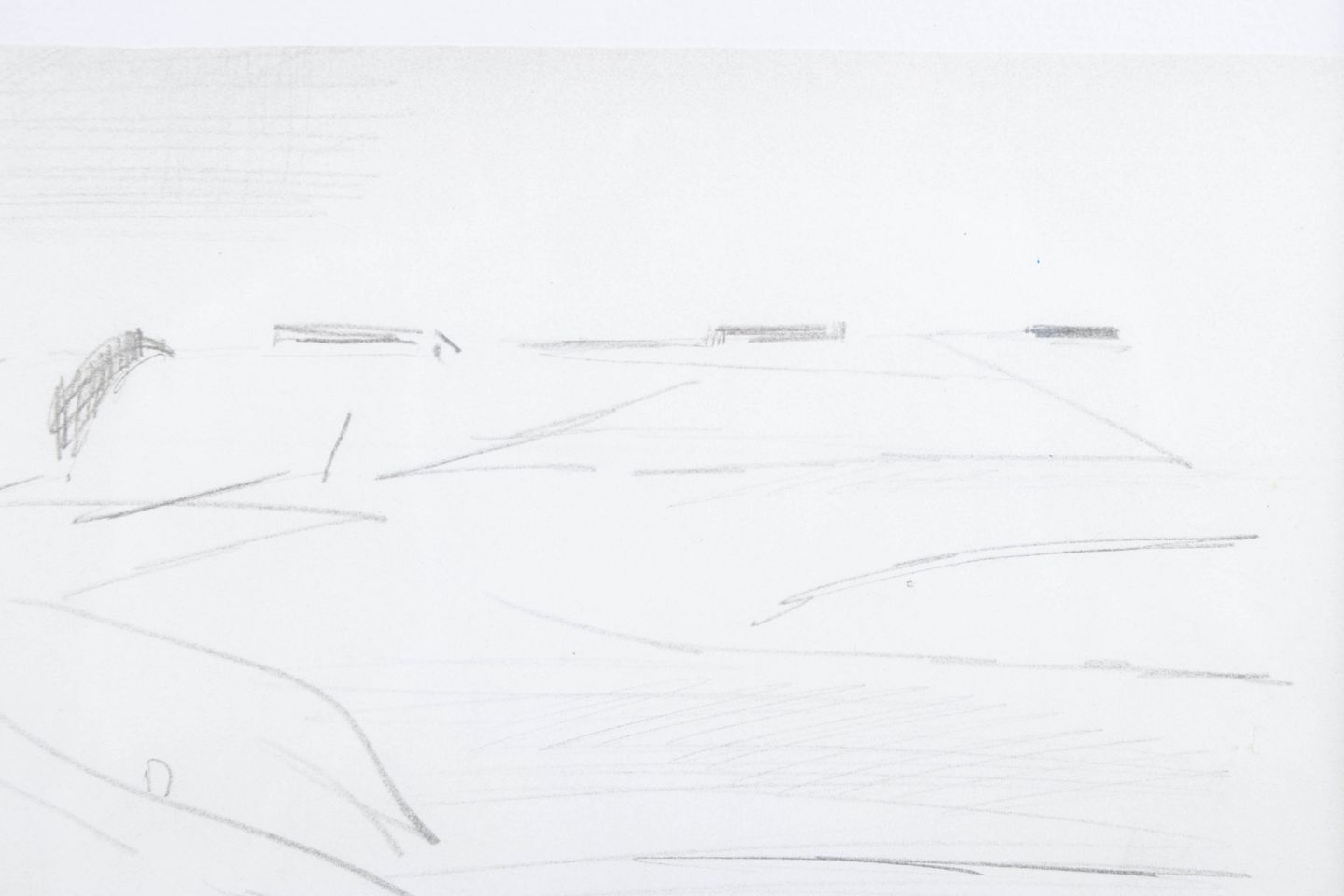 Dansk landskabsmotiv udført som blyantstegning med let abstraheret komposition og rolige, horisontale linjer.