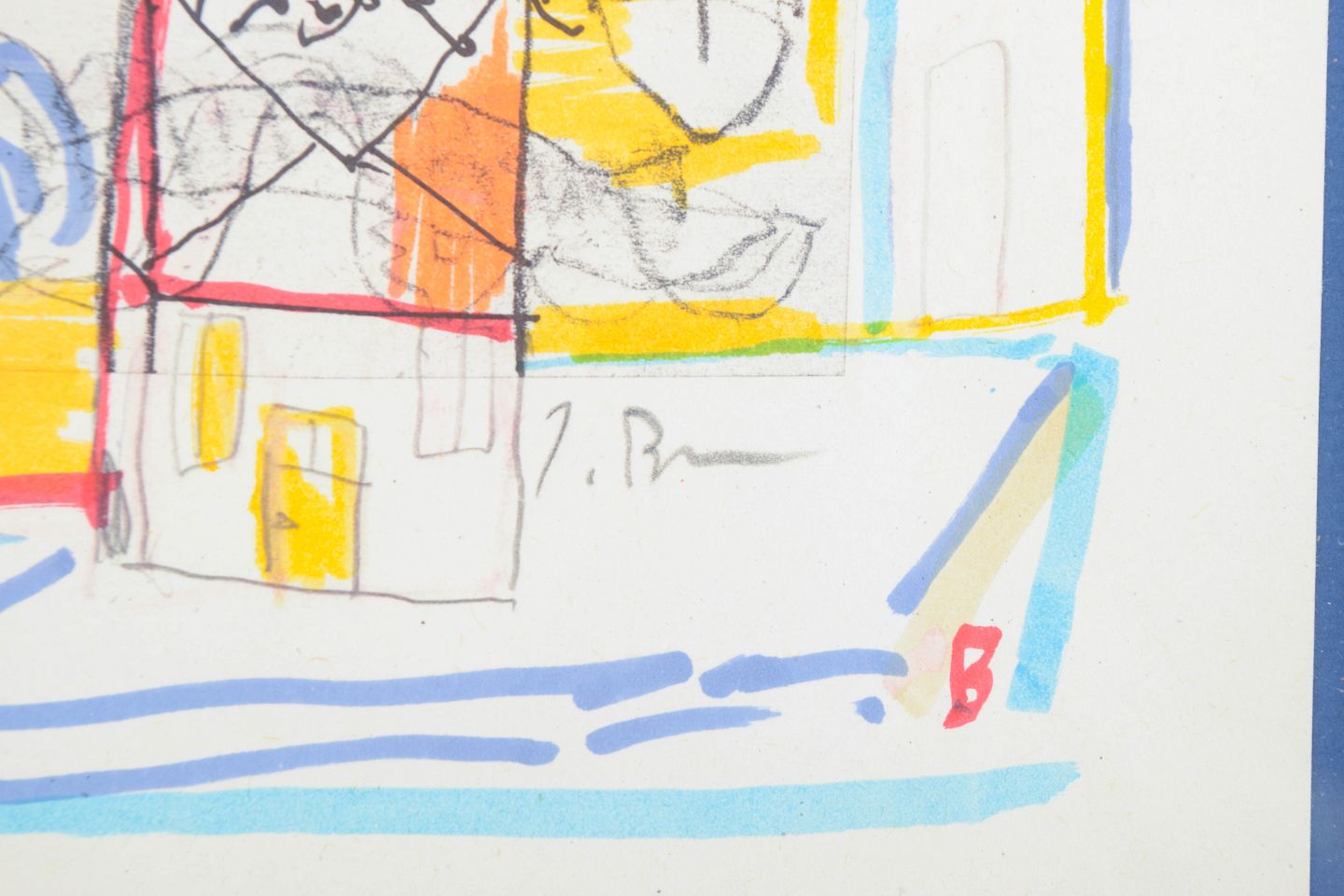Abstrakt og figurativt sammensat motiv med ekspressive linjer og farvefelter, udført i blandteknik på papir. Kompositionen kombinerer skitseprægede figurer med geometriske former og transparente farvelag. Signeret.