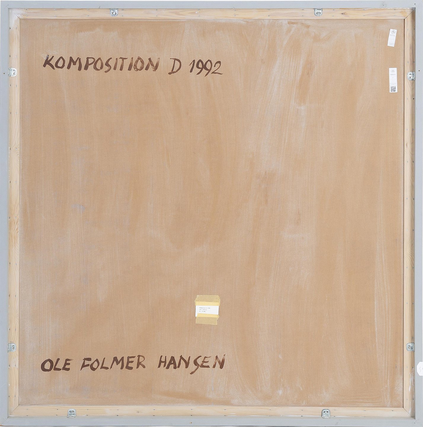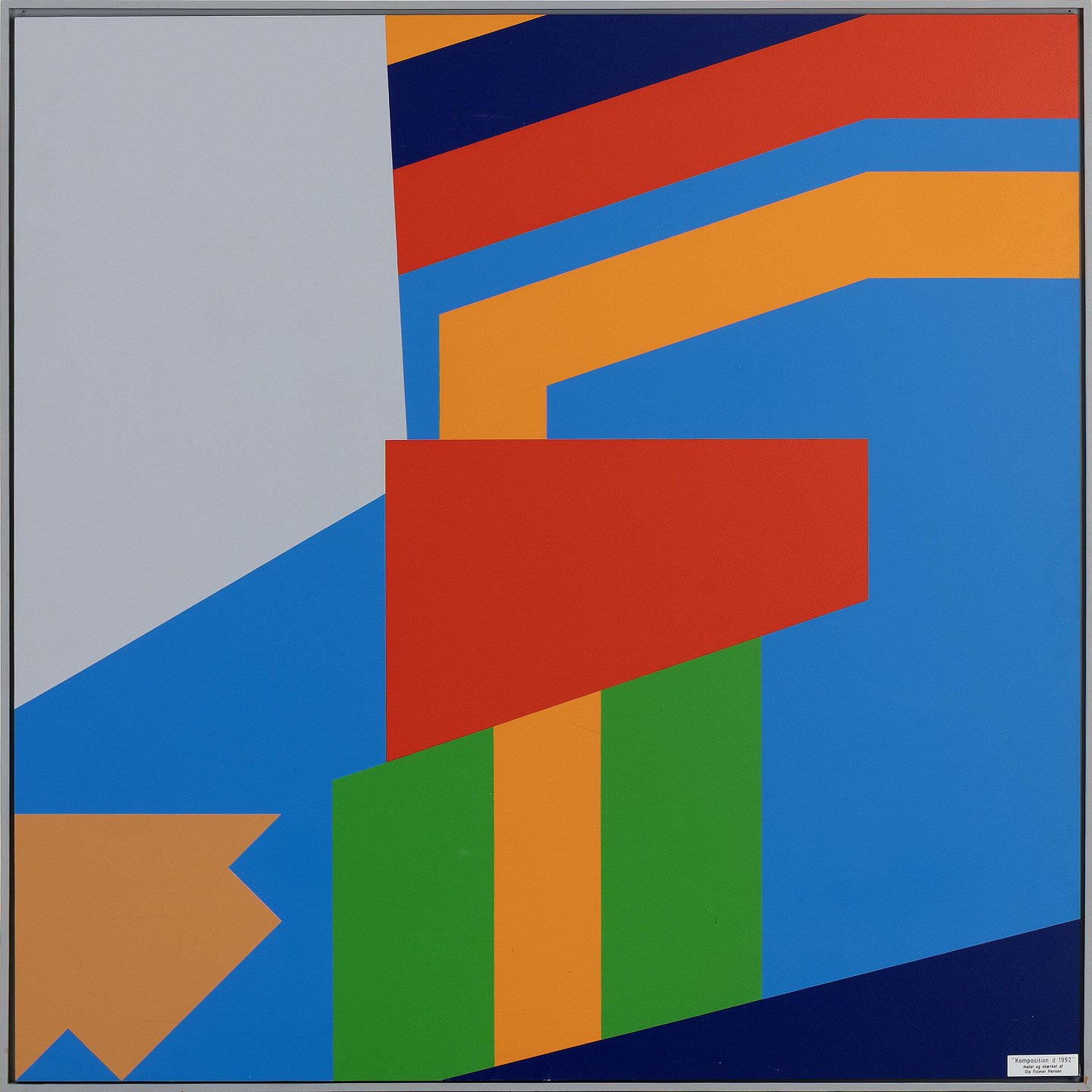 Stor flot konkret komposition, malet på plade. Kvalitets indramning i gråmalet naturtræ. Galleri pris i 1992 var 35000.-