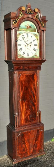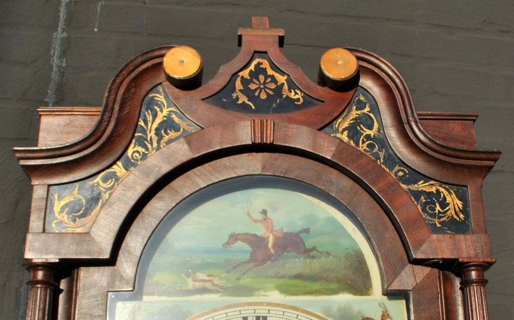 T. Airer, 18. Jahrhundert. Liverpool, England: Standuhr im Stil Ludwigs XVI. Mahagoni mit Viertelsäulen und Schwanenkopf. Bemaltes Zifferblatt mit Jagdszene und Tieren. Bemaltes Glas auf der Oberseite. Höhe: 225 cm. Breite: 55 cm. Tiefe: 25 cm.