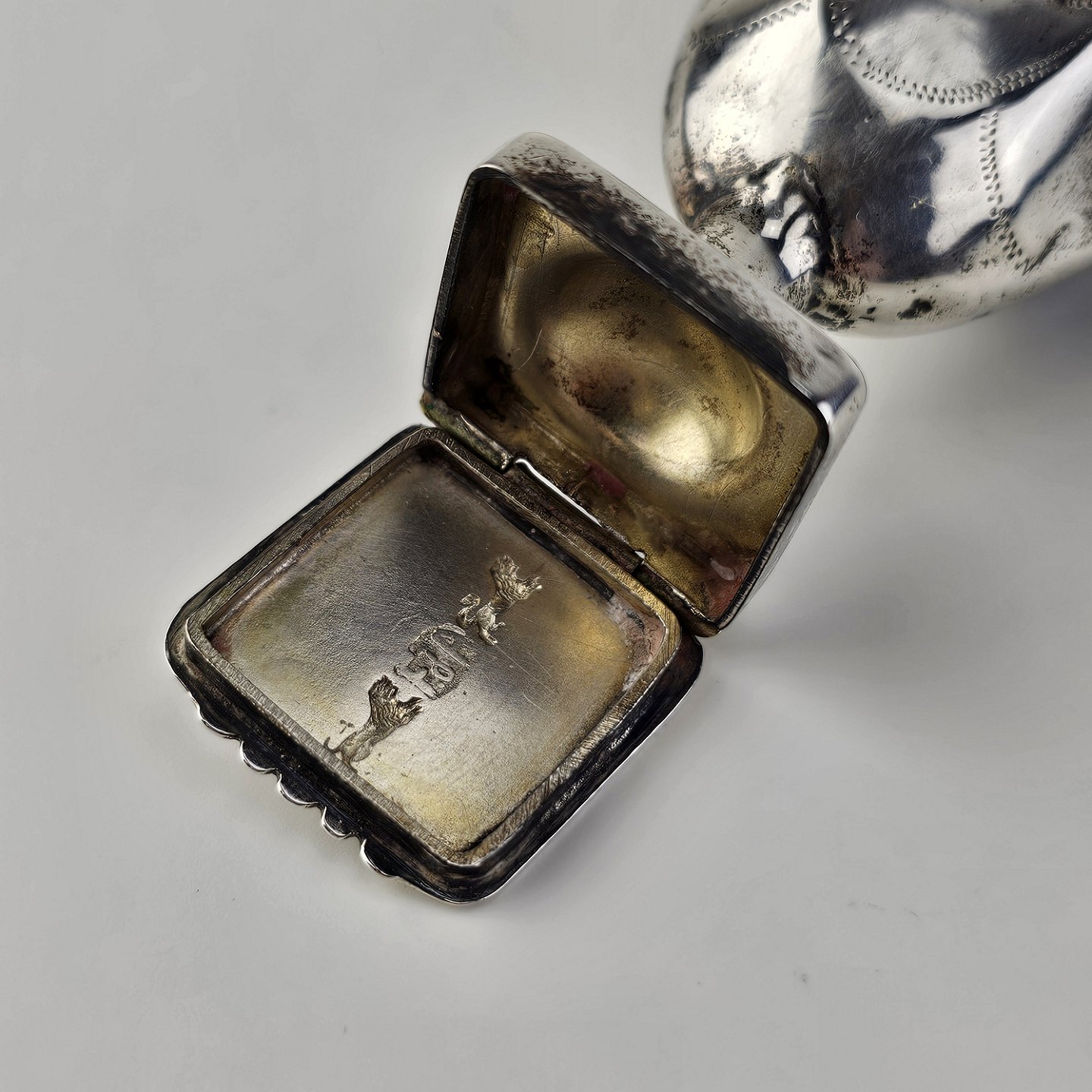 Hovedvandsæg i sølv dekoreret med forskellige smykkesten og en fugl på toppen