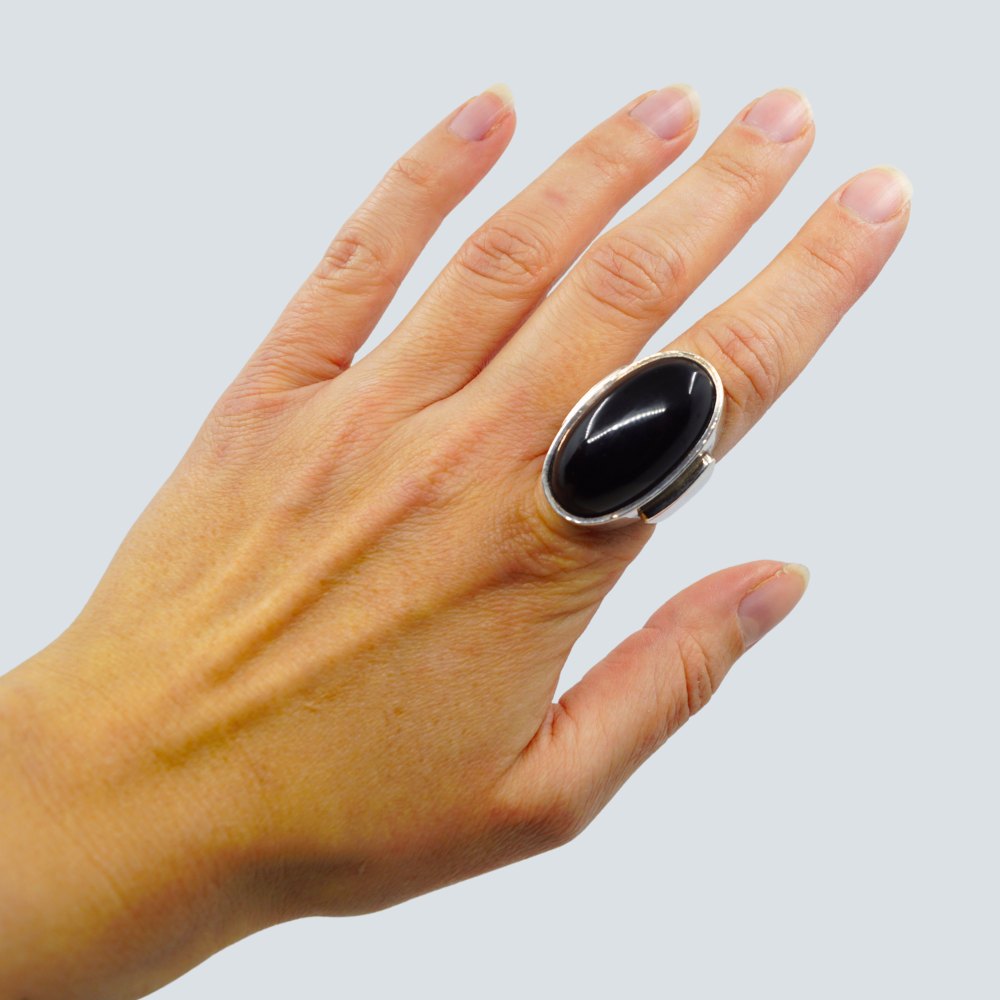 Text zugänglich auf Dänische: Georg Jensen; Ring af sterling sølv prydet med stor oval onyx.