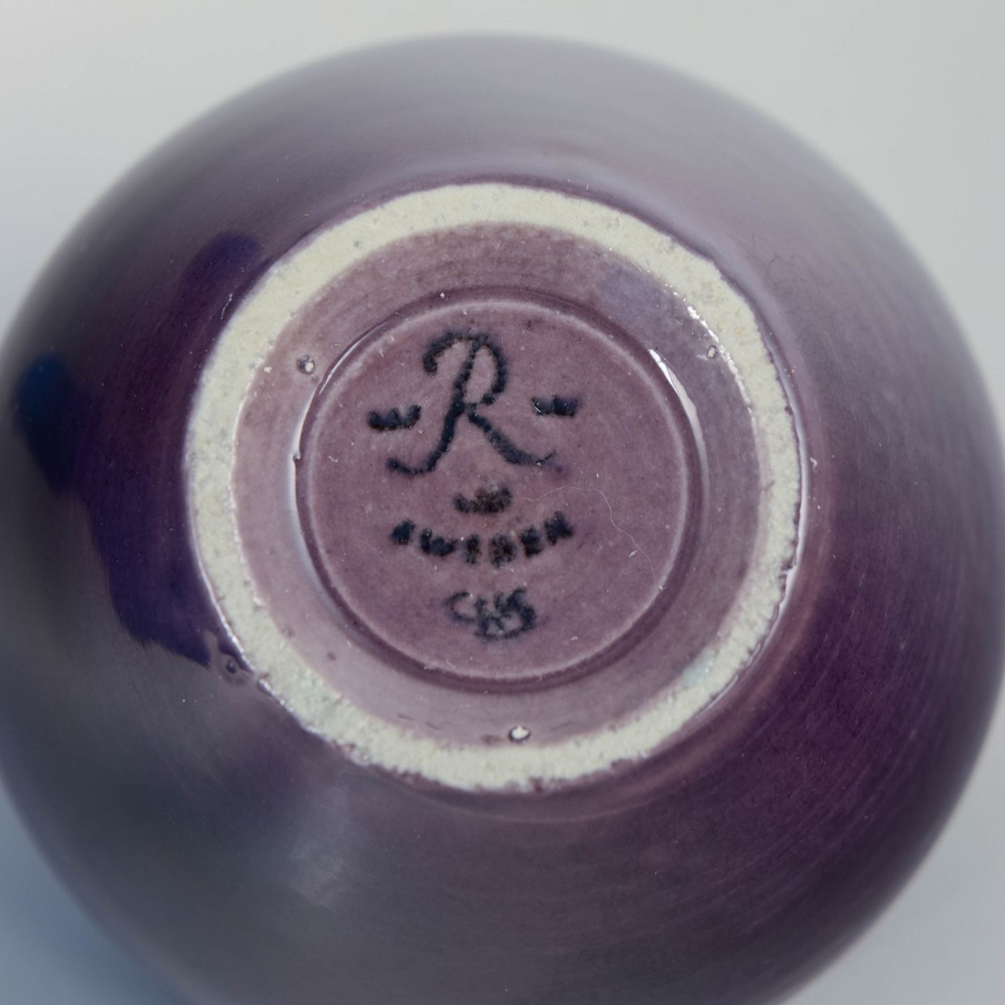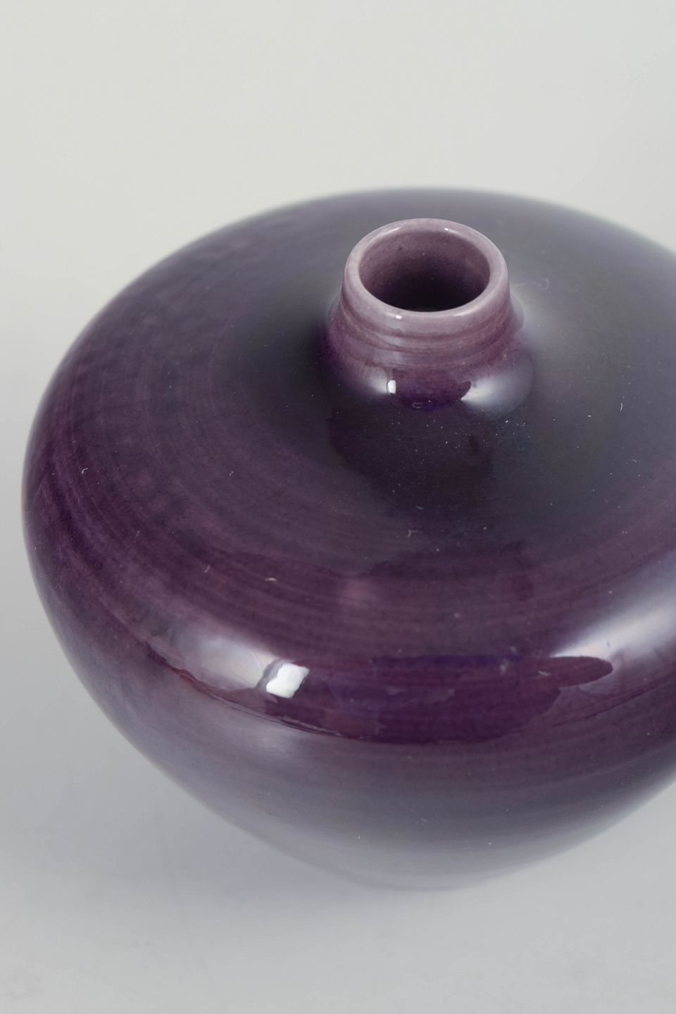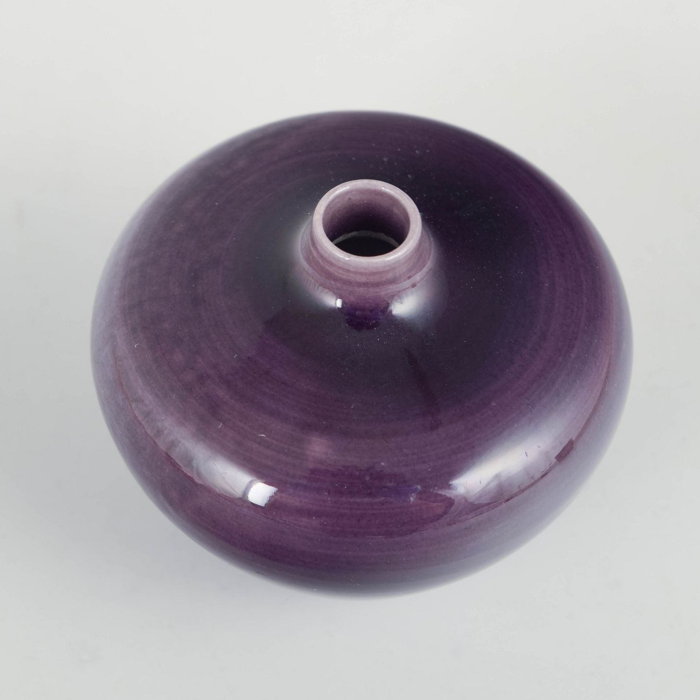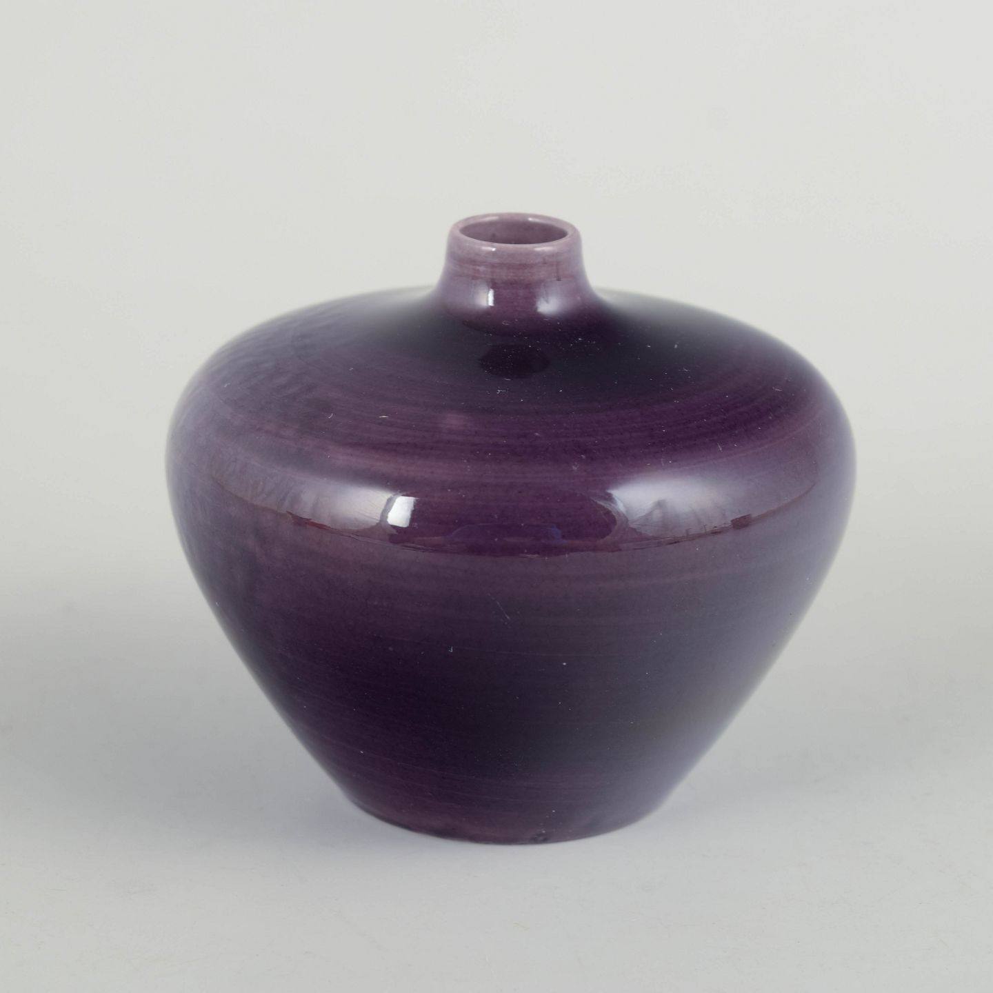 Lille drejet vase i stentøj med blank violet glasur og blød, afrundet form, udført i høj fabrikskvalitet.