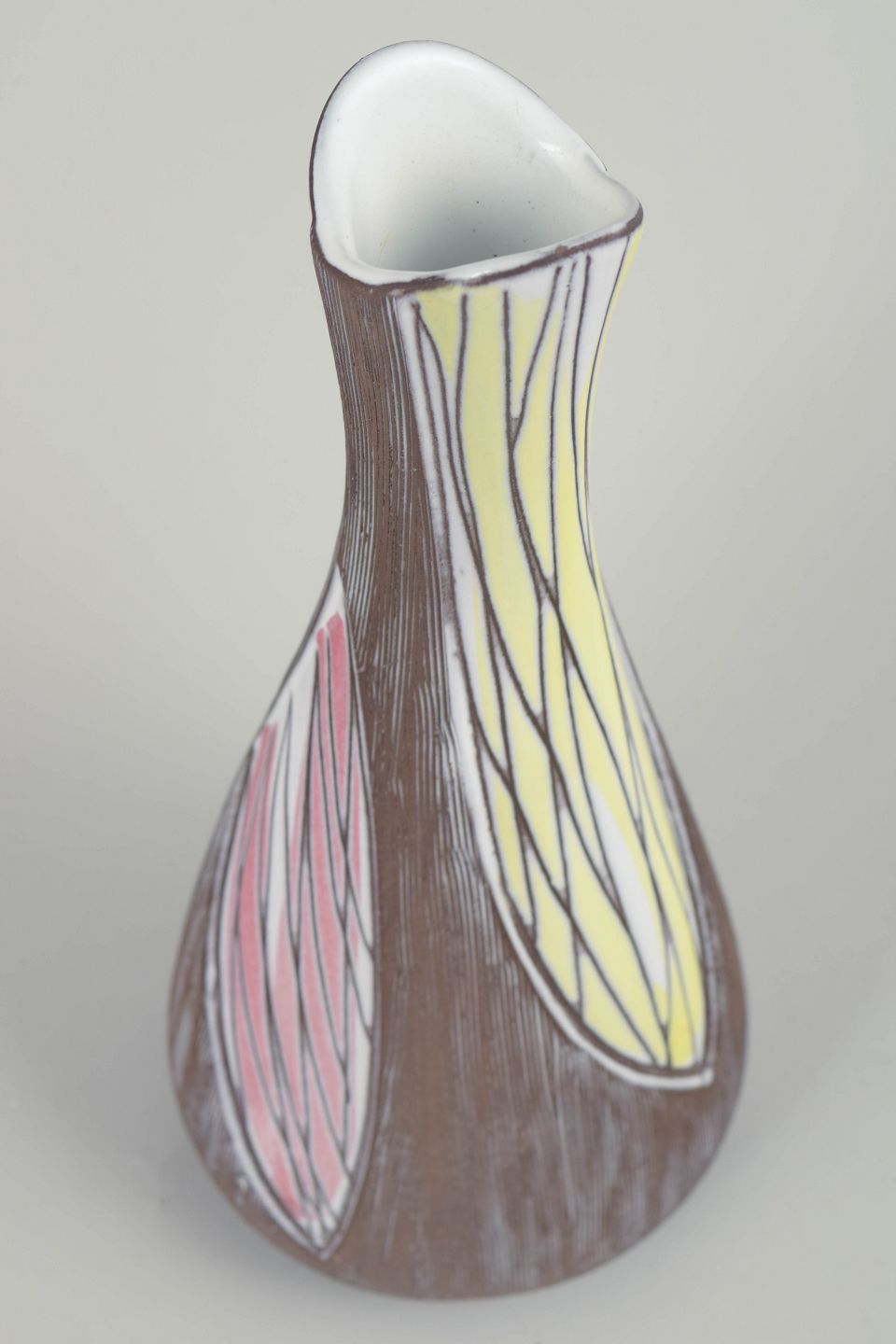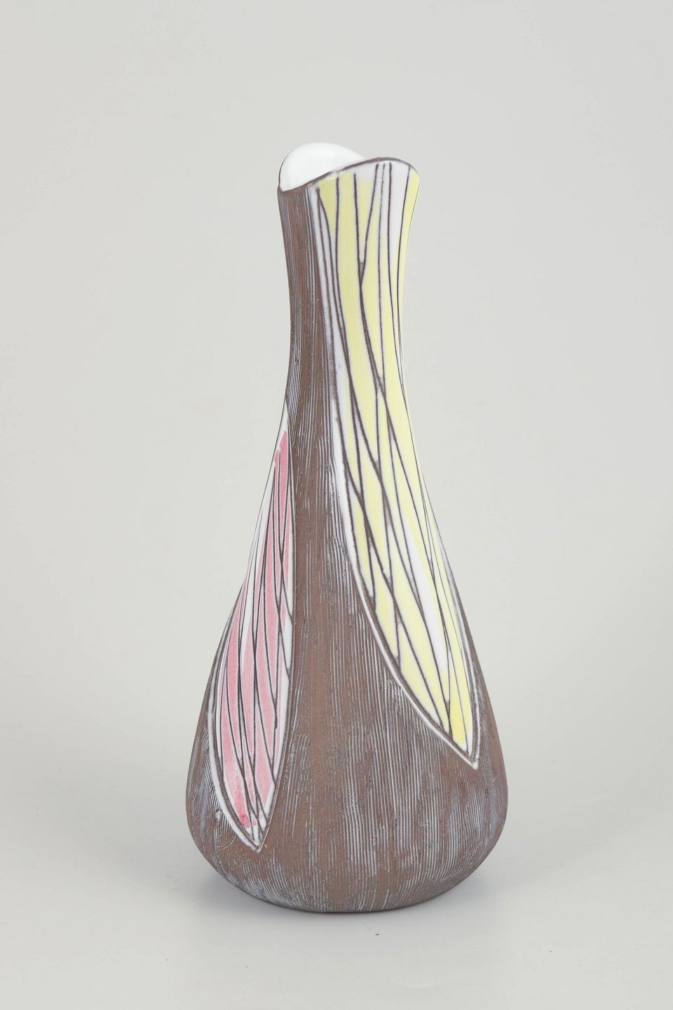 Slank figurativ vase model 4417 med stiliseret dekoration i brun, gul og rosa glasur med indridset linjearbejde.