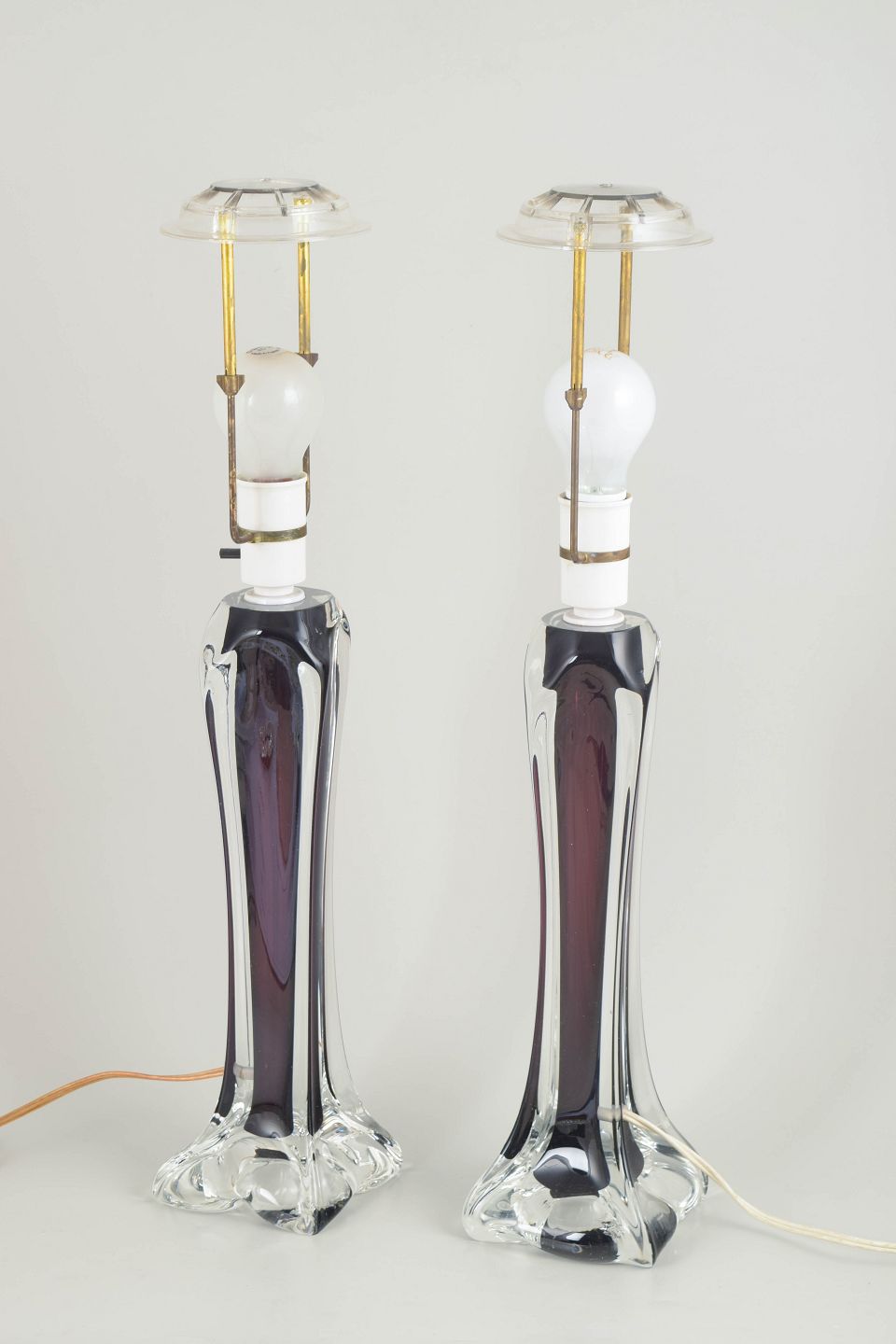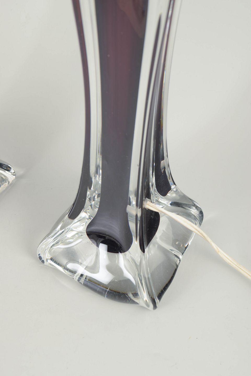 Sæt med to bordlamper i lilla kunstglas med facetslebne, høje former og klar fod. Klassiske fatninger i plast og messing, typisk for svensk glasdesign fra 1970’erne.