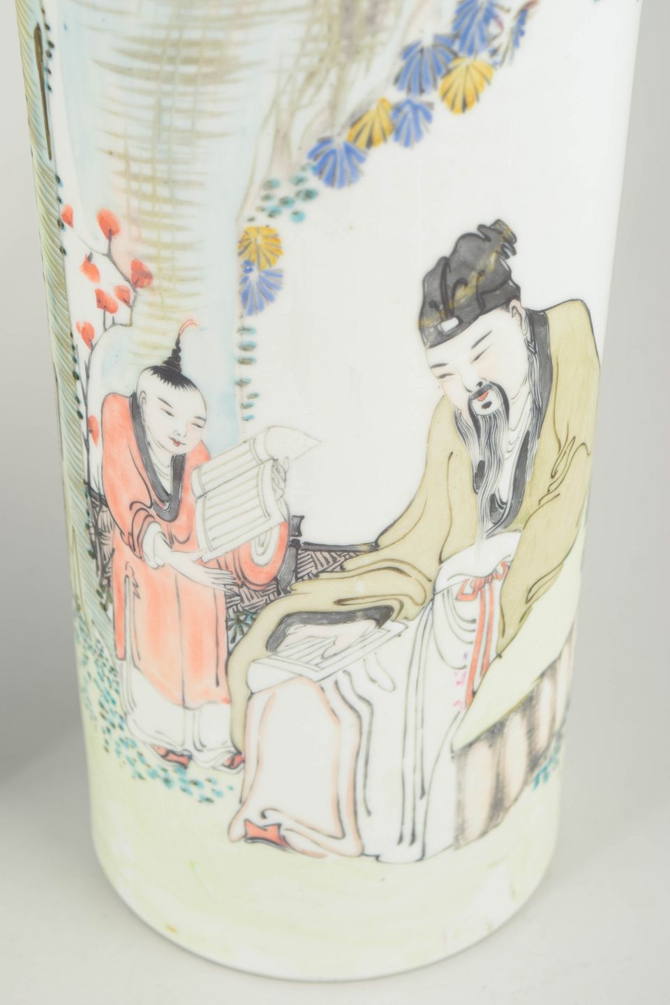 Par cylindriske vaser i porcelæn, hånddekoreret med figurscener i emaljefarver samt kalligrafi og segl. Den kalligrafiske tekst kan oversættes til: “Blomsternes duft er ren og vidtrækkende; de elegante blomster afspejler en forfinet smag og udtrykker ro, harmoni og samklang mellem natur og menneske.”