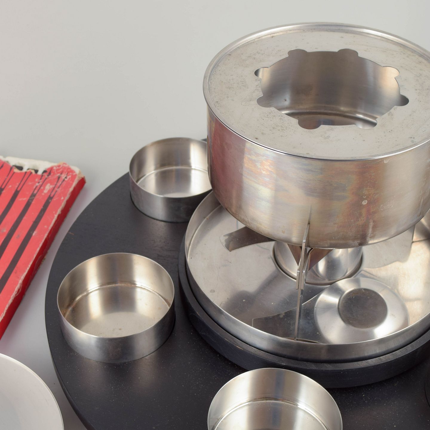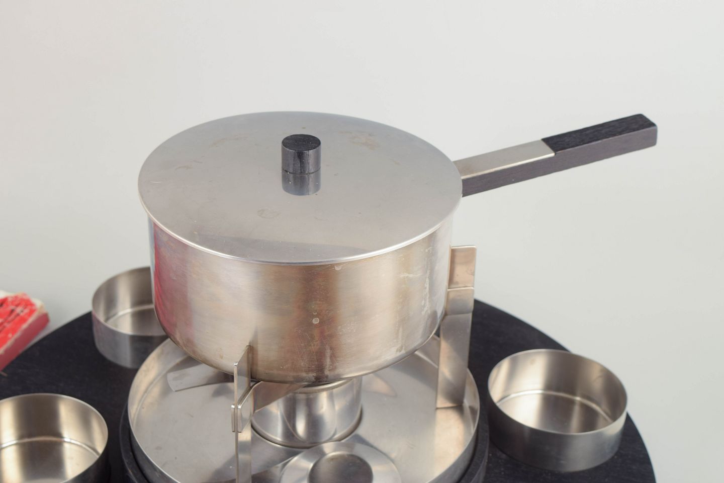 Stort fonduesæt i rustfrit stål med gryde, brænder, sort sokkel og seks skåle og spyd, udført i et stramt funktionalistisk formsprog.