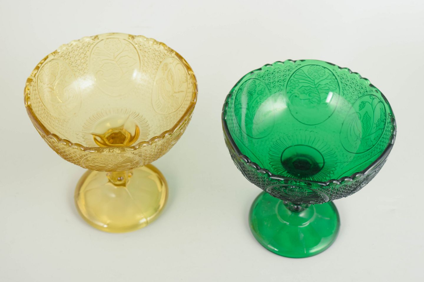 Sæt med to dessertskåle i presset glas i ravgul og grøn tone med reliefdekoreret kumme og balusterformet fod.