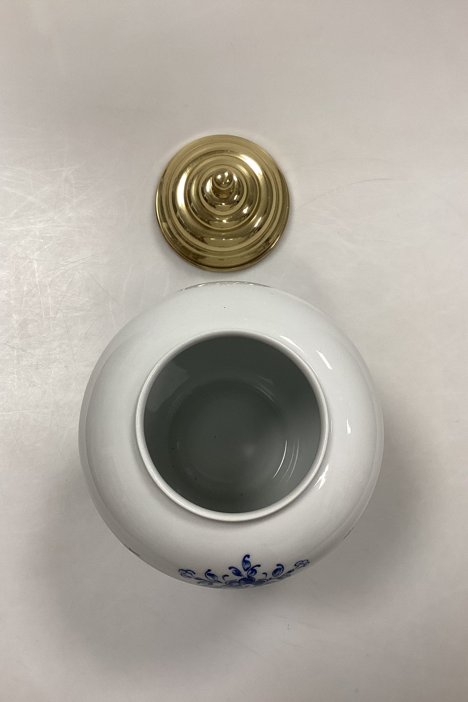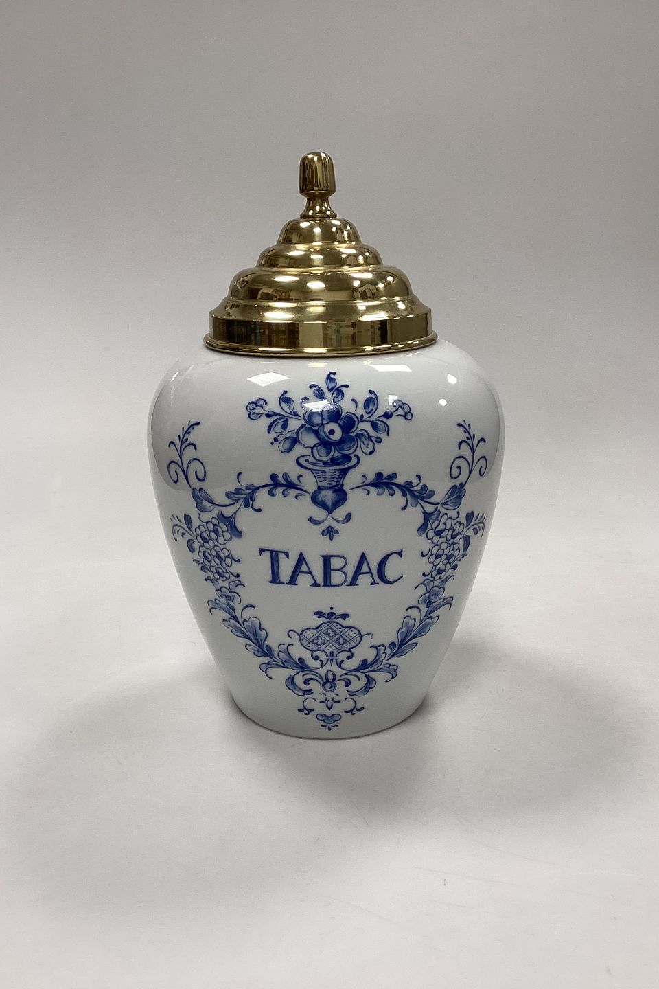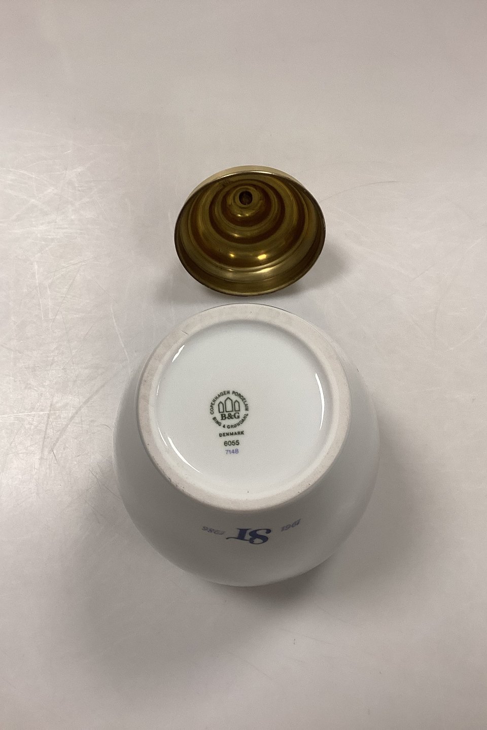 Bing og Grøndahl Tobakskrukke - Tabac No.6055/7148. Fremstillet i anledning af Skandinavisk Tobakskompagnis 25-års Jubilæum (1961-1986). Porcelæn med messinglåg. Logo på bagsiden: 1961 ST 1986.