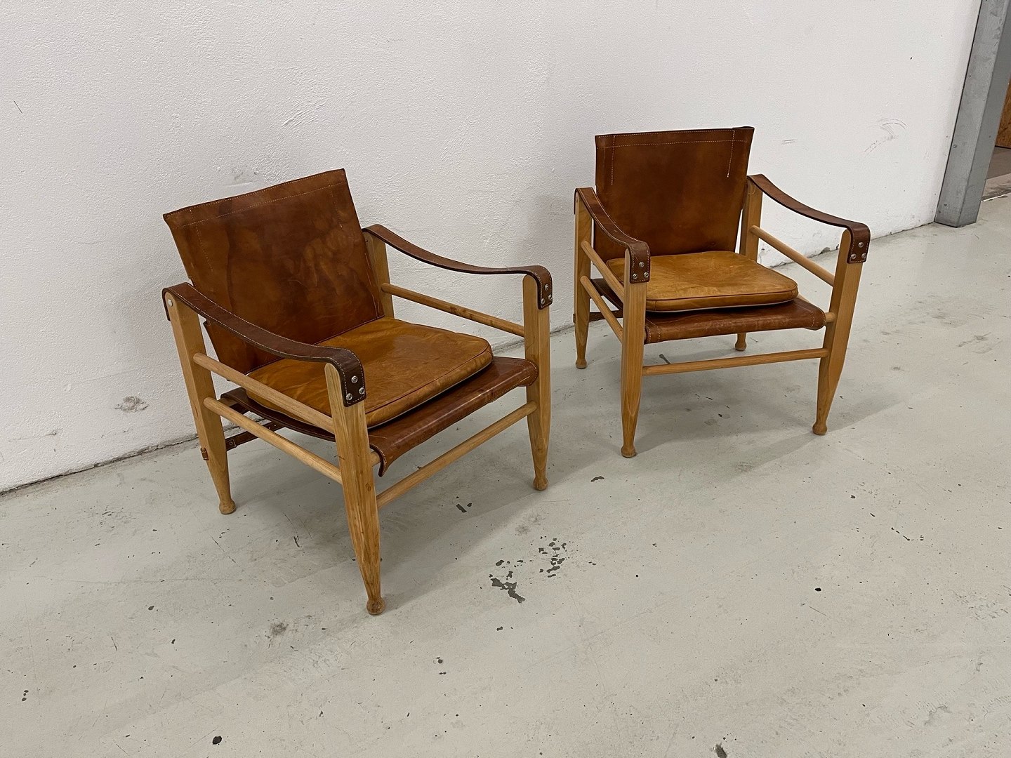 Aage Bruun & Søn – Safari-Stühle, 1960er Jahre. Ein absolut einzigartiges und außergewöhnlich gut erhaltenes Set Safari-Stühle von Aage Bruun & Søn aus den 1960er Jahren. Die Stühle bestehen aus einem Gestell aus massivem Buchenholz und sind mit cognacfarbenem, patiniertem Leder bezogen (Sitzfläche, Rückenlehne und Armlehnen). Das Leder weist eine wunderschöne Patina auf, und sowohl Schnallen als auch Riemen und Gestelle sind in makellosem Originalzustand. Die Stühle stammen aus einem Nichtraucherhaushalt ohne Haustiere und waren seit ihrer Anschaffung in Erstbesitz. Das Set besteht aus einem originalen Ledersofa und Kissen. Maße: Höhe: 67 cm – Breite: 55 cm – Tiefe: 57 cm – Sitzhöhe: 36 cm.