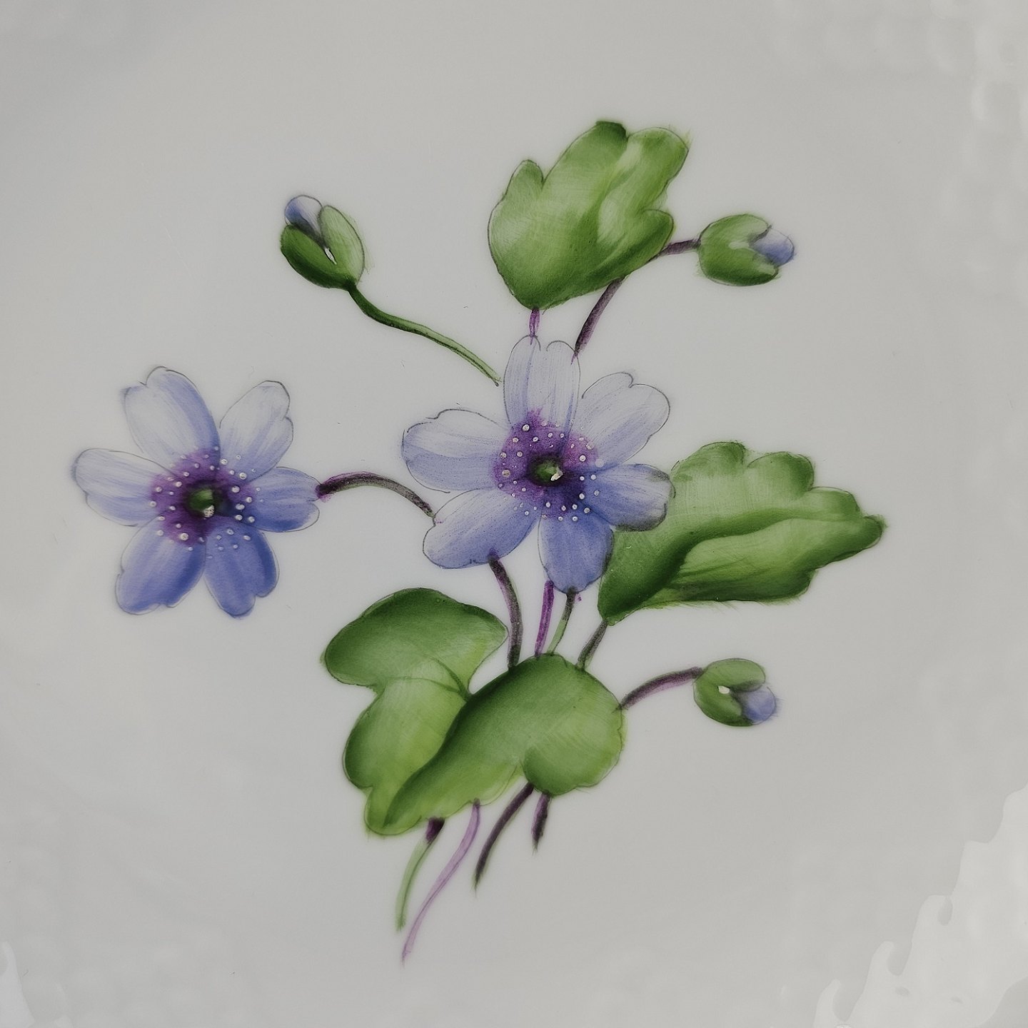 Antonius er af hvidt porcelæn med skælform dekoreret med håndmalede blå anemoner og guldkant. Også kendt under navnet Blå Anemone.