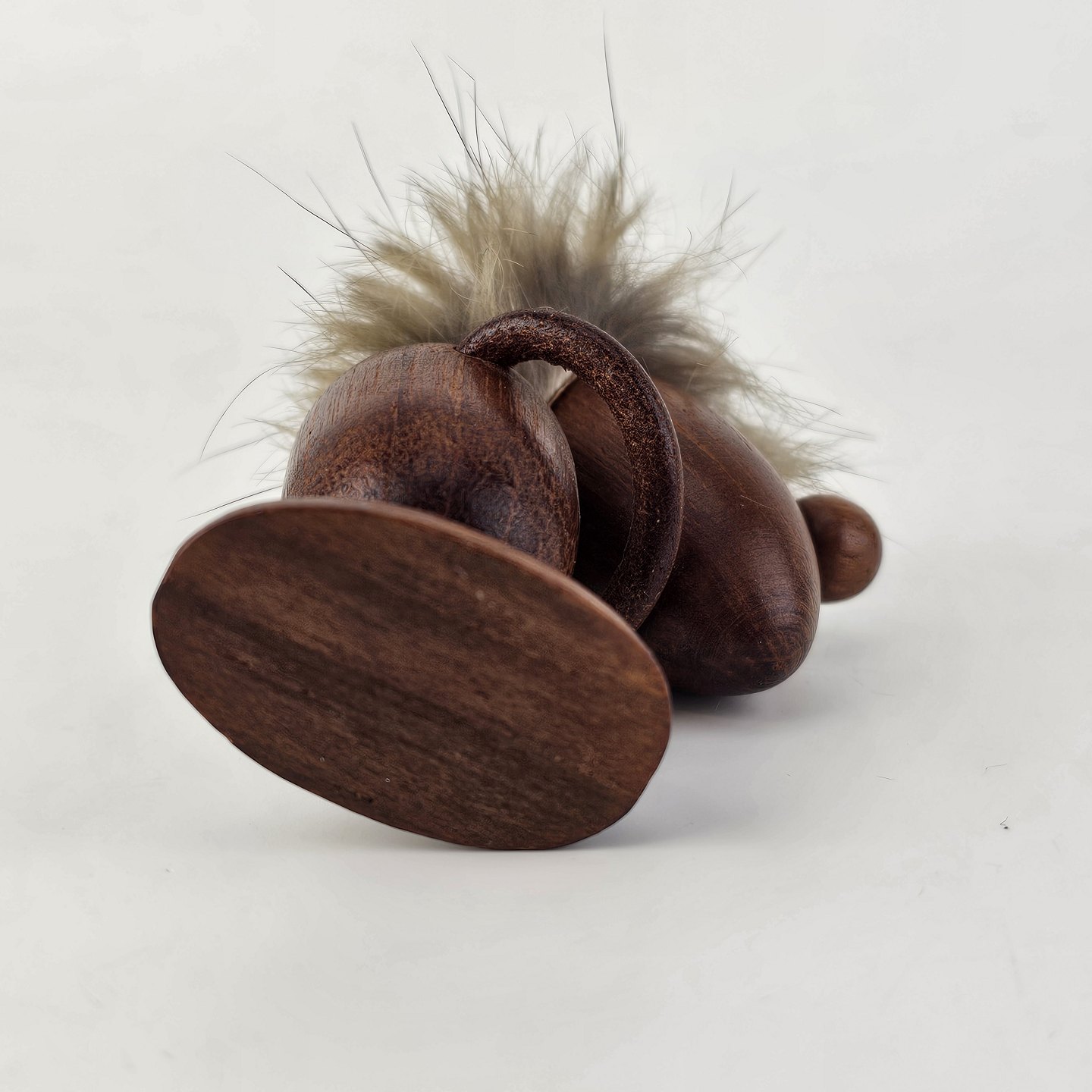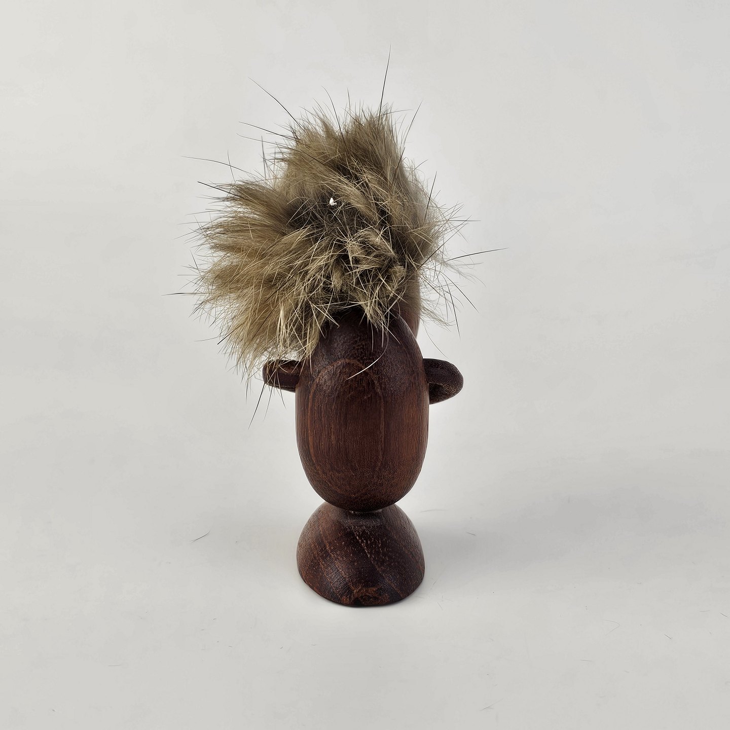 Håndskåret figur af teak med støvet blond hår og arme af læder. Fra 1960'erne