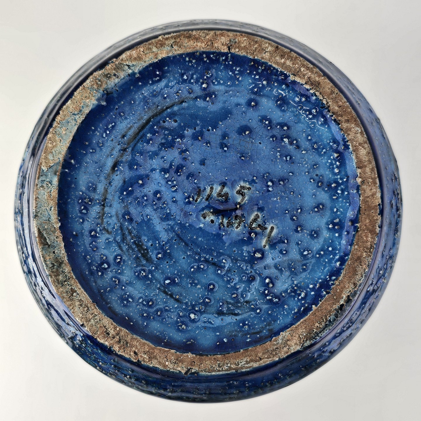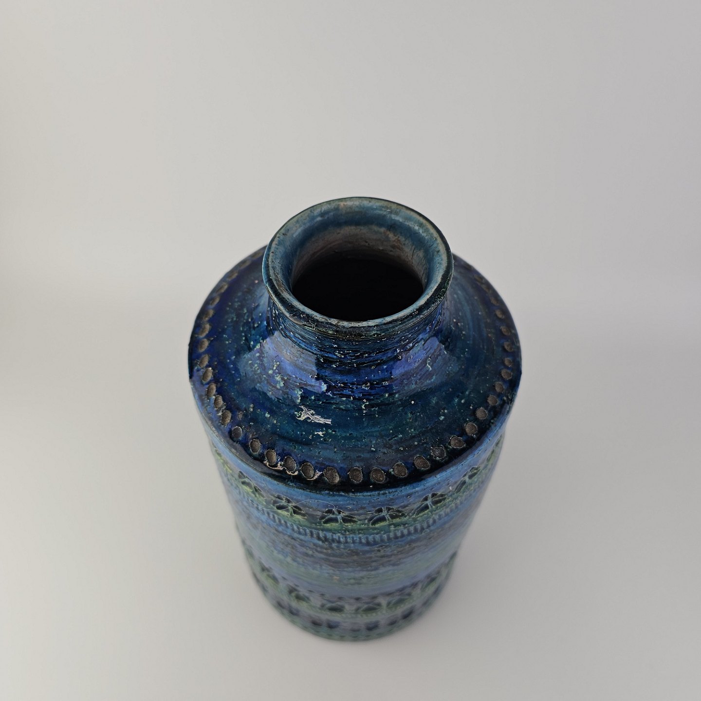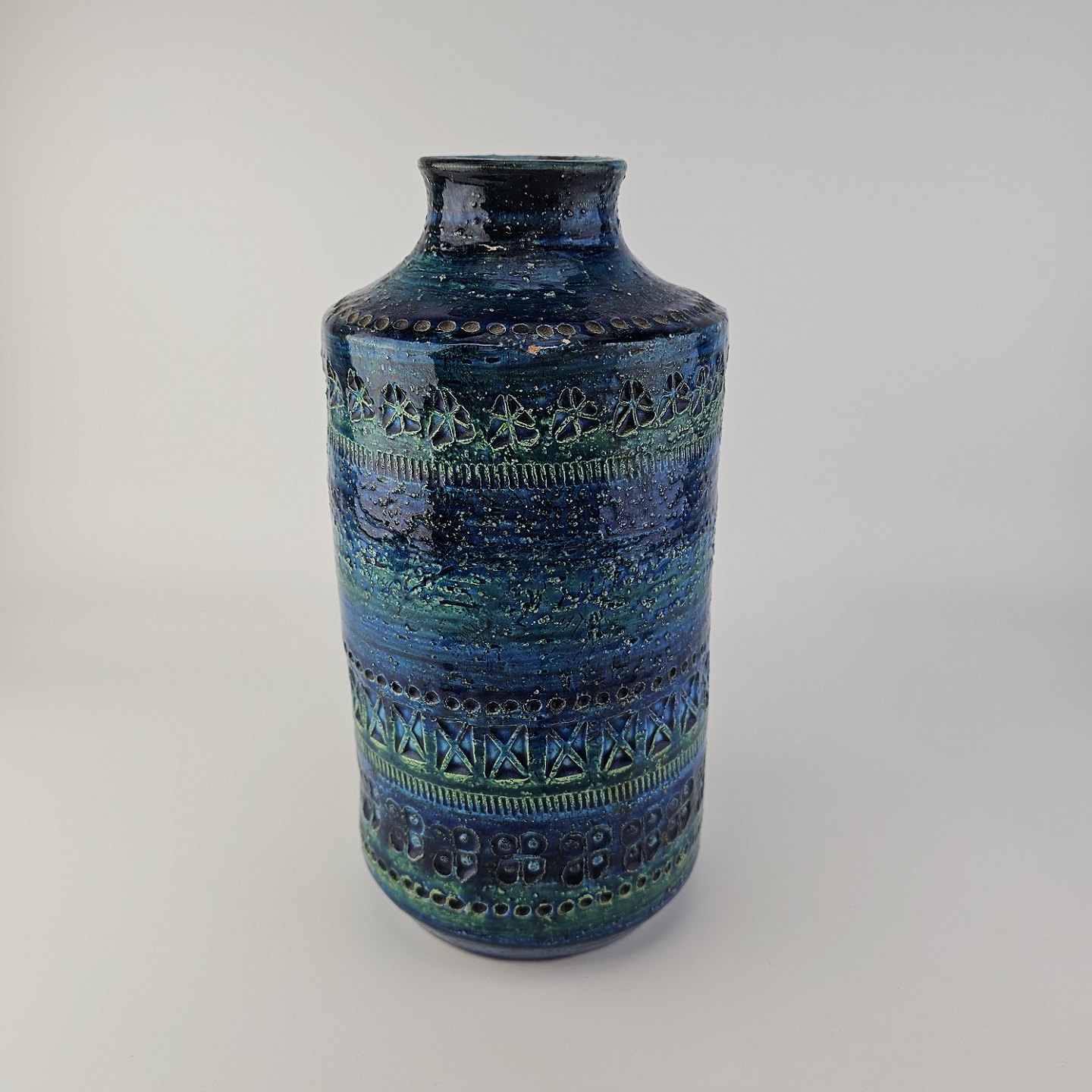 Vase af keramik med rimini blå glasering og geometriske mønstre