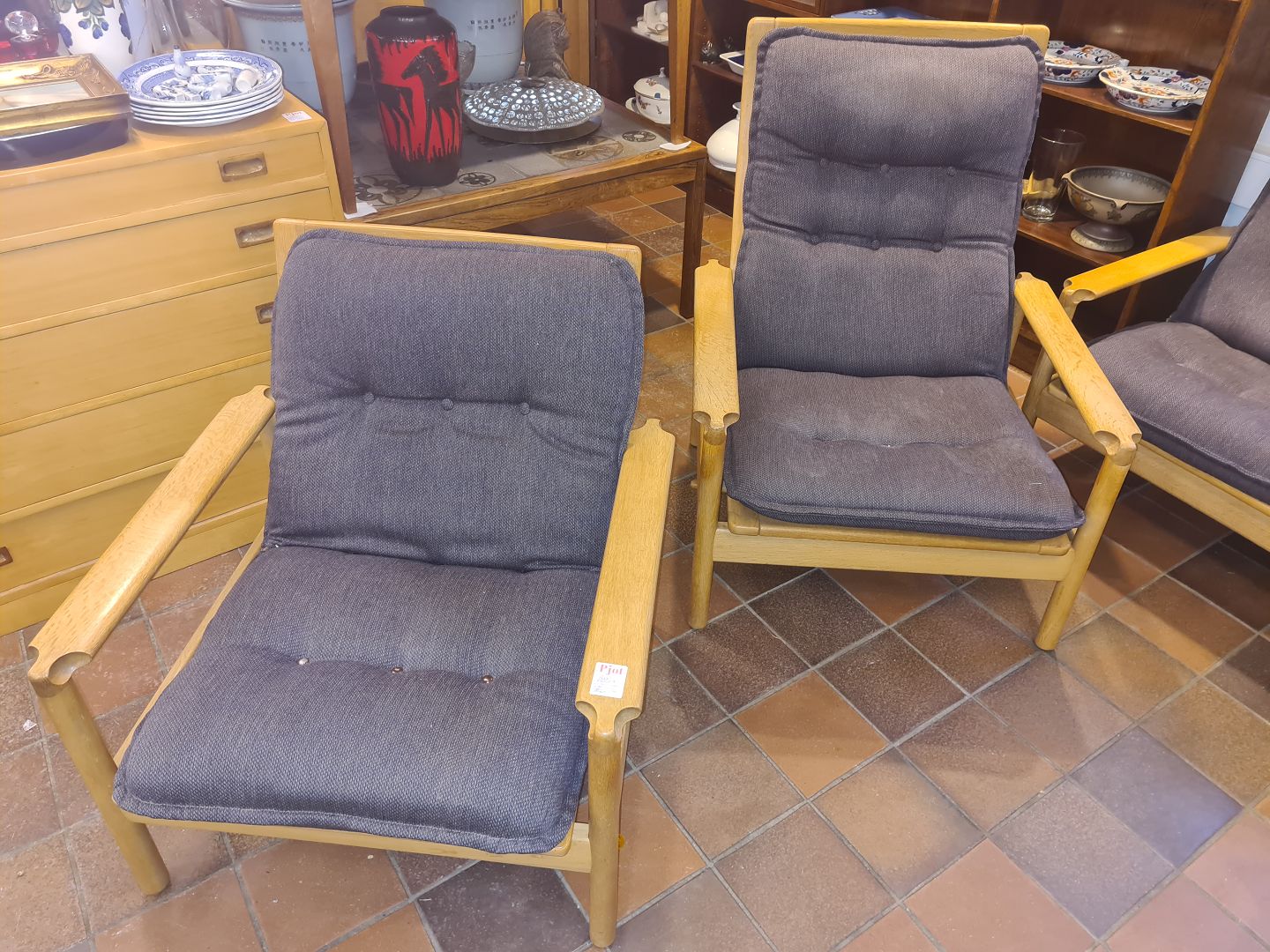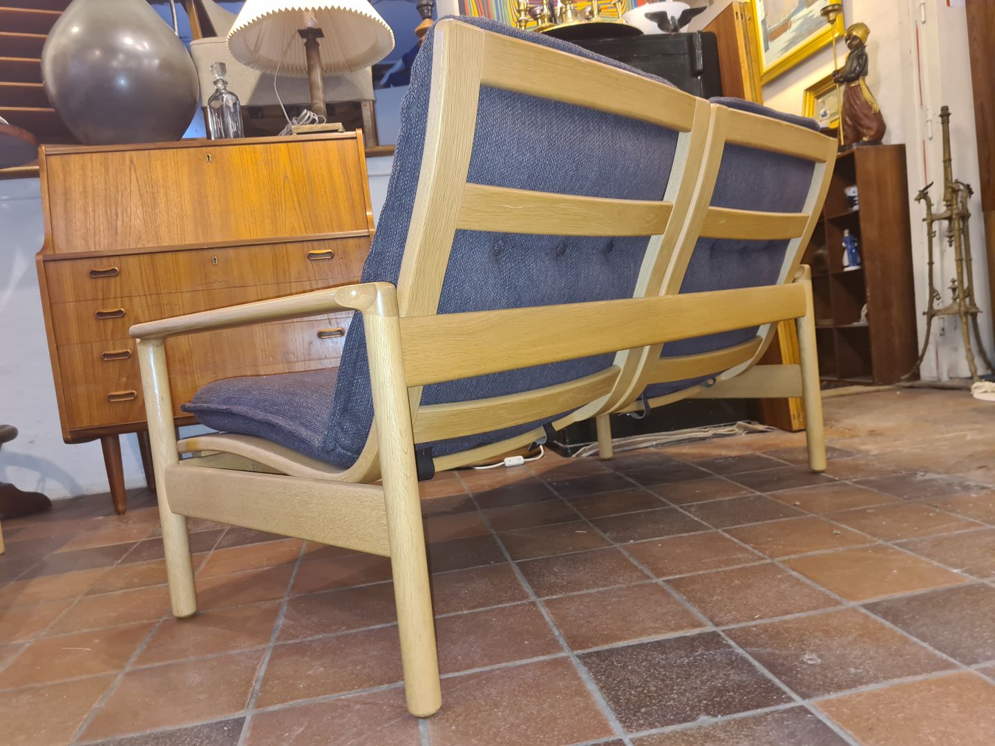 Text zugänglich auf Dänische: Sofagruppe udført i massiv lakeret eg m. hynder i uldstof. Produceret af Madsen & Schubell Møbelfabrik ca. 1970'erne. Fremstår i pæn brugt stand.