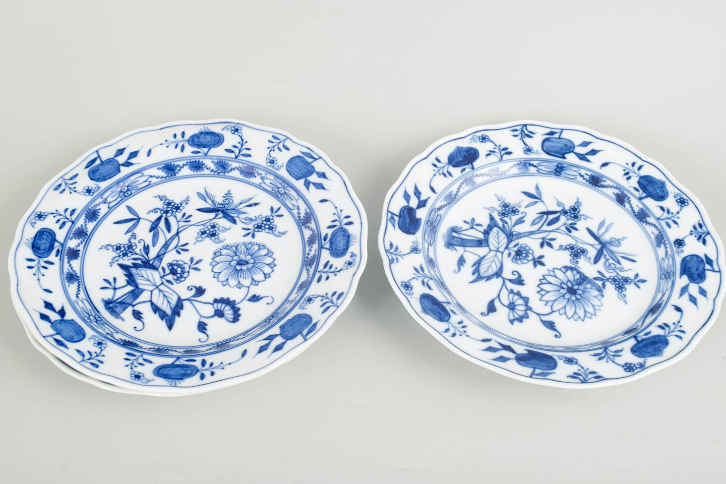 Middagstallerkener i hvidt porcelæn dekoreret i underglasur, løgmønster med bølget fane. Mærket i bunden med Meissens krydsede sværd.