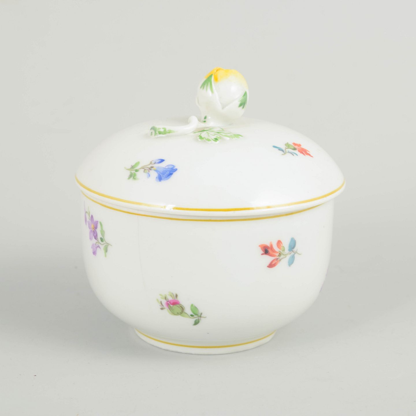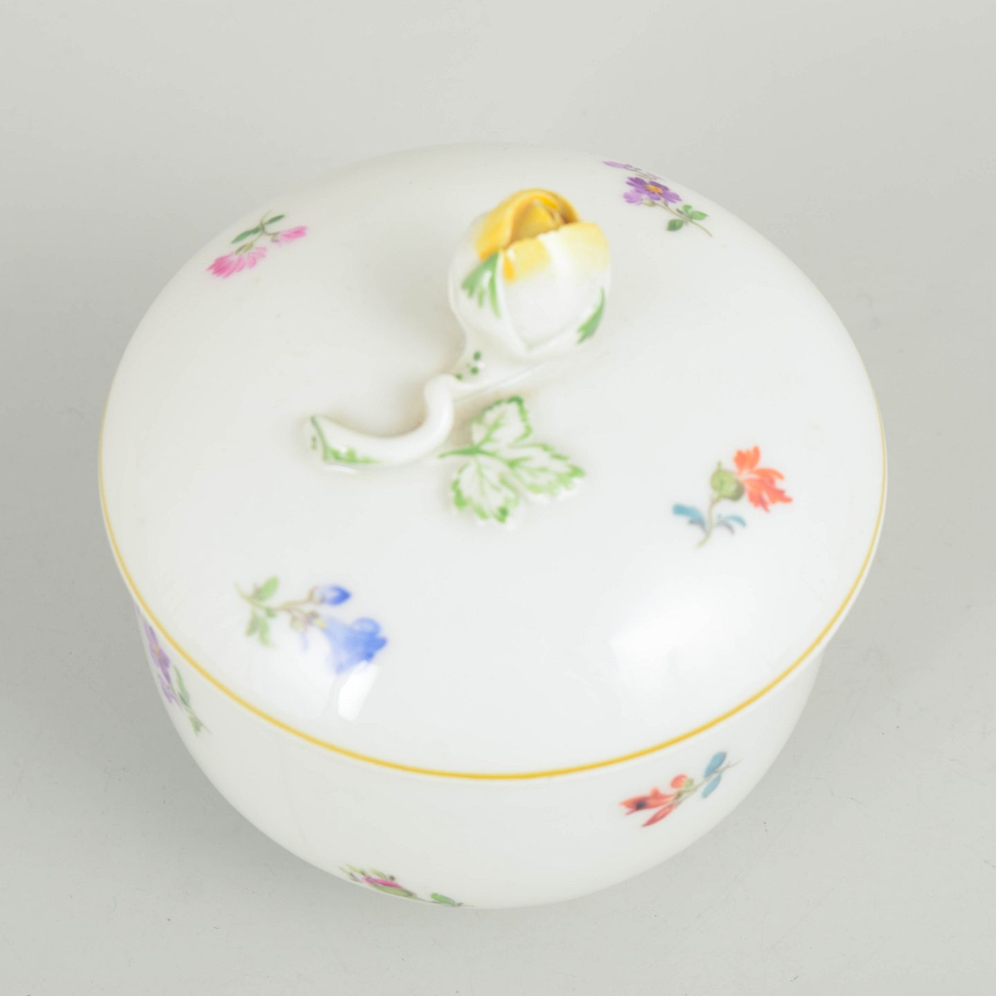 Rund lågskål i hvidt porcelæn dekoreret med spredte håndmalede polykrome blomster og diskret forgyldning langs rand og fod. Knopgreb udformet som en roseknop. Mærket i bunden med Meissens krydsede sværd.