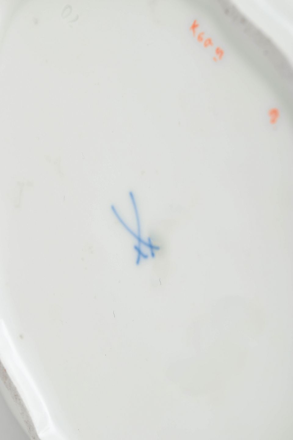 Lille ovalt fad i porcelæn dekoreret med håndmalet rosa rose i midten, omgivet af diskret reliefdekoration langs kanten. Klassisk udførelse fra Meissen med fin glasur og elegant formgivning, typisk for perioden.