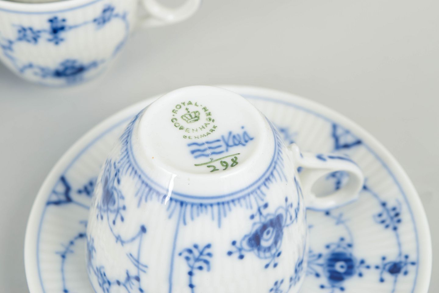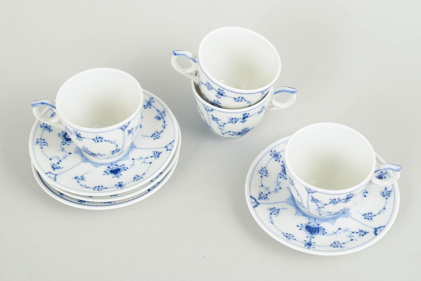 Text zugänglich auf Dänische: Royal Copenhagen, Musselmalet riflet kaffekopper med tilhørende underkopper, sæt af 4.
